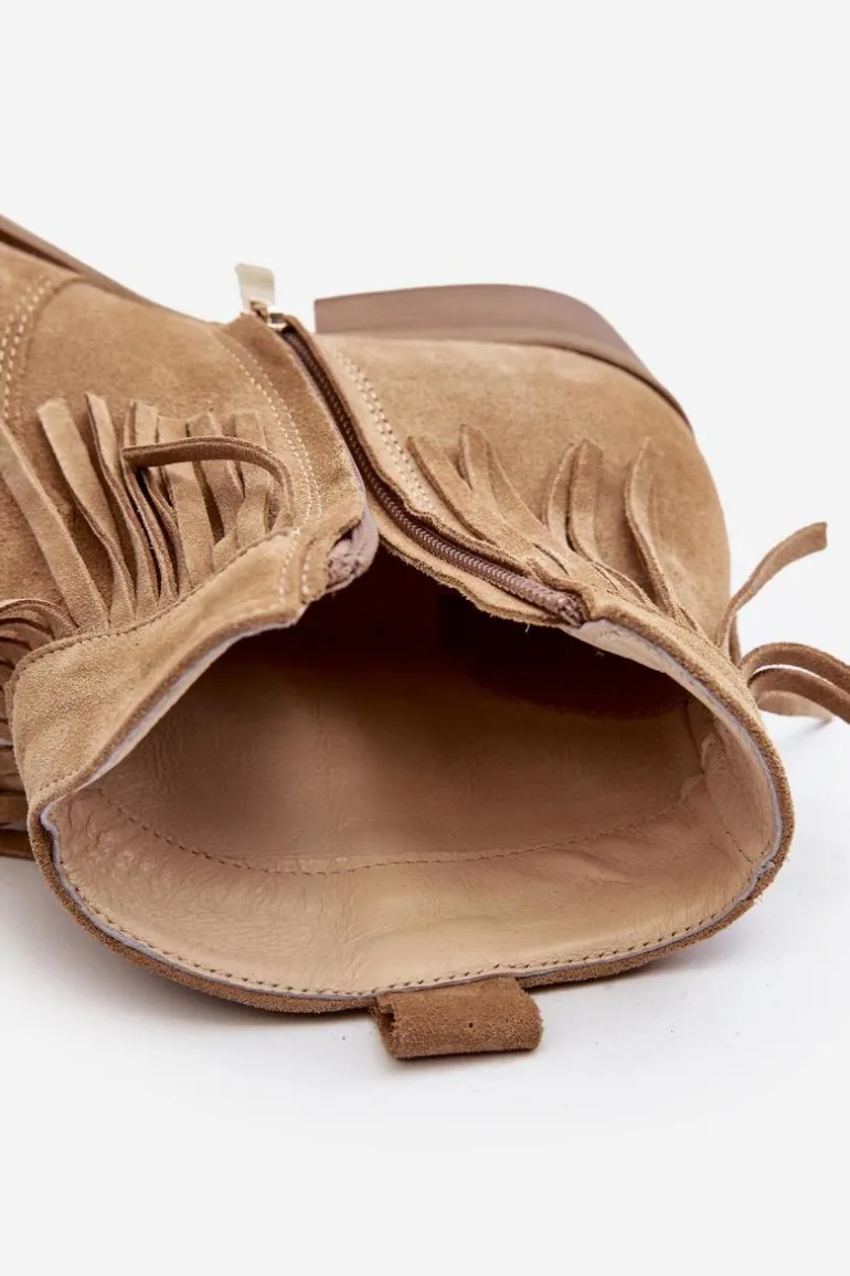 Botki damskie wykonane ze skóry naturalnej. Zapinane na suwak. Cholewka ozdobiona frędzlami. Noski w szpic optycznie wysmuklą nogi. Model ten będzie doskonałym dopełnieniem wiosennych stylizacji. Idealne do spódnic, sukienek, jak i spodni. Fason ten z pewnością przyciągnie uwagę swoim unikalnym stylem. Koniecznie powinnaś je mieć! Przy wyborze rozmiaru prosimy sugerować się tabelą rozmiarów.