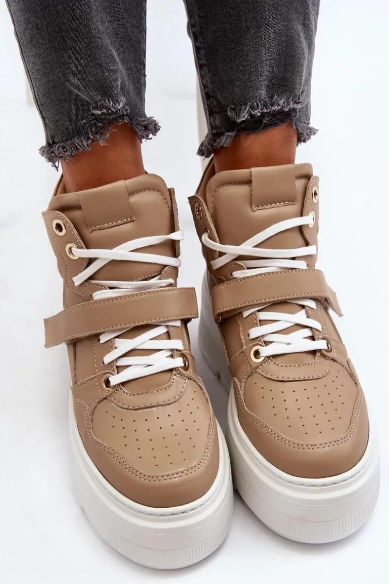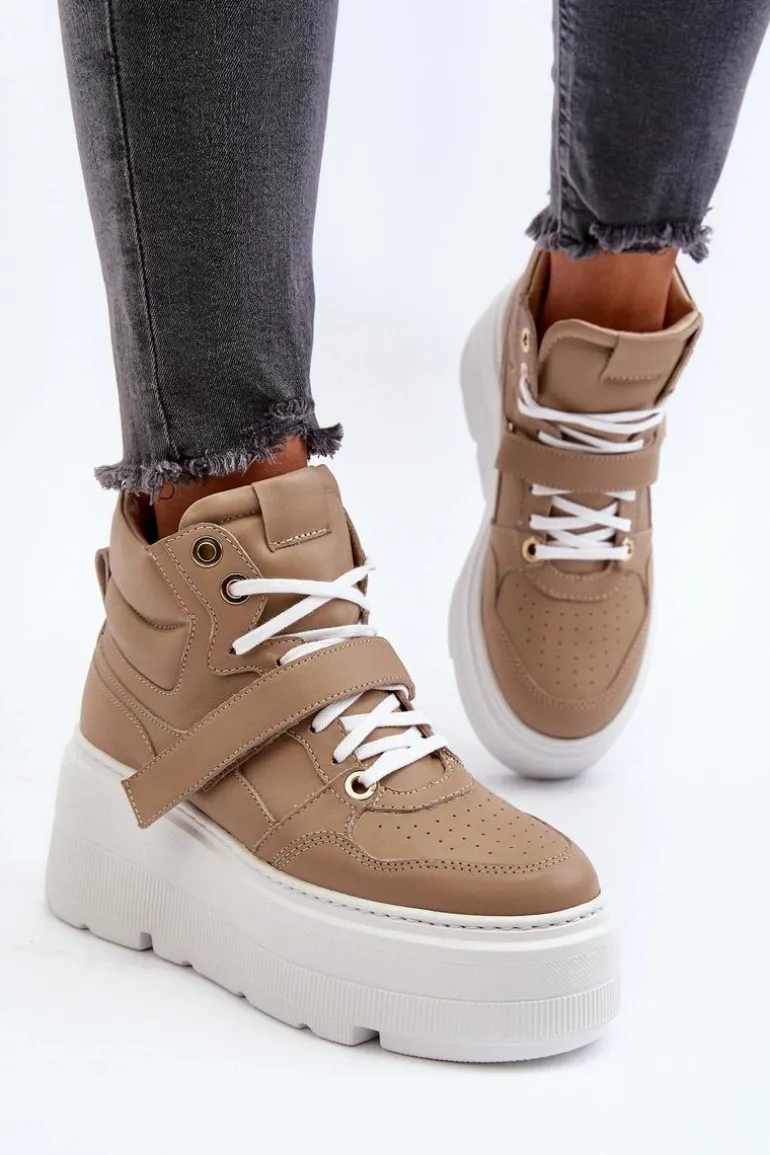 Damskie sneakersy wykonane z wysokiej jakości skóry naturalnej. Sznurowanie wzbogacone o dodatkowe zapięcie na rzep, gwarantuje doskonałe dopasowanie do stopy, zapewniając stabilność podczas chodzenia. Platforma nie tylko dodaje charakteru całej stylizacji, ale także zapewnia stabilność i komfort podczas chodzenia. Idealne zarówno na spacer po mieście, jak i na wieczorne wyjście ze znajomymi, te sneakersy są niezastąpionym elementem w garderobie każdej modnej kobiety.