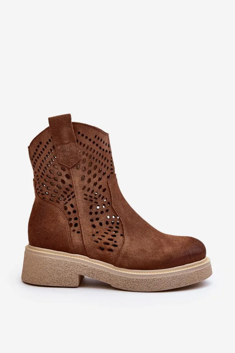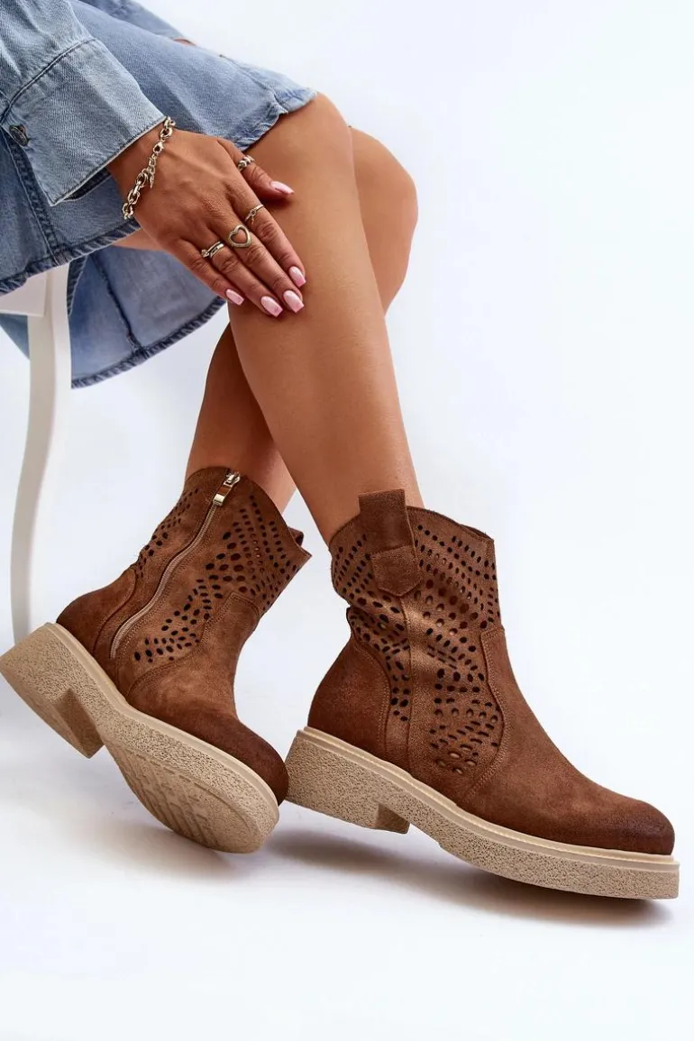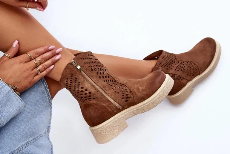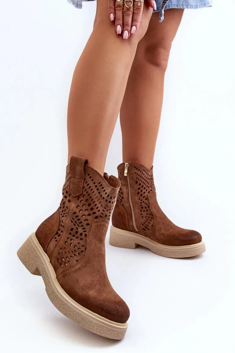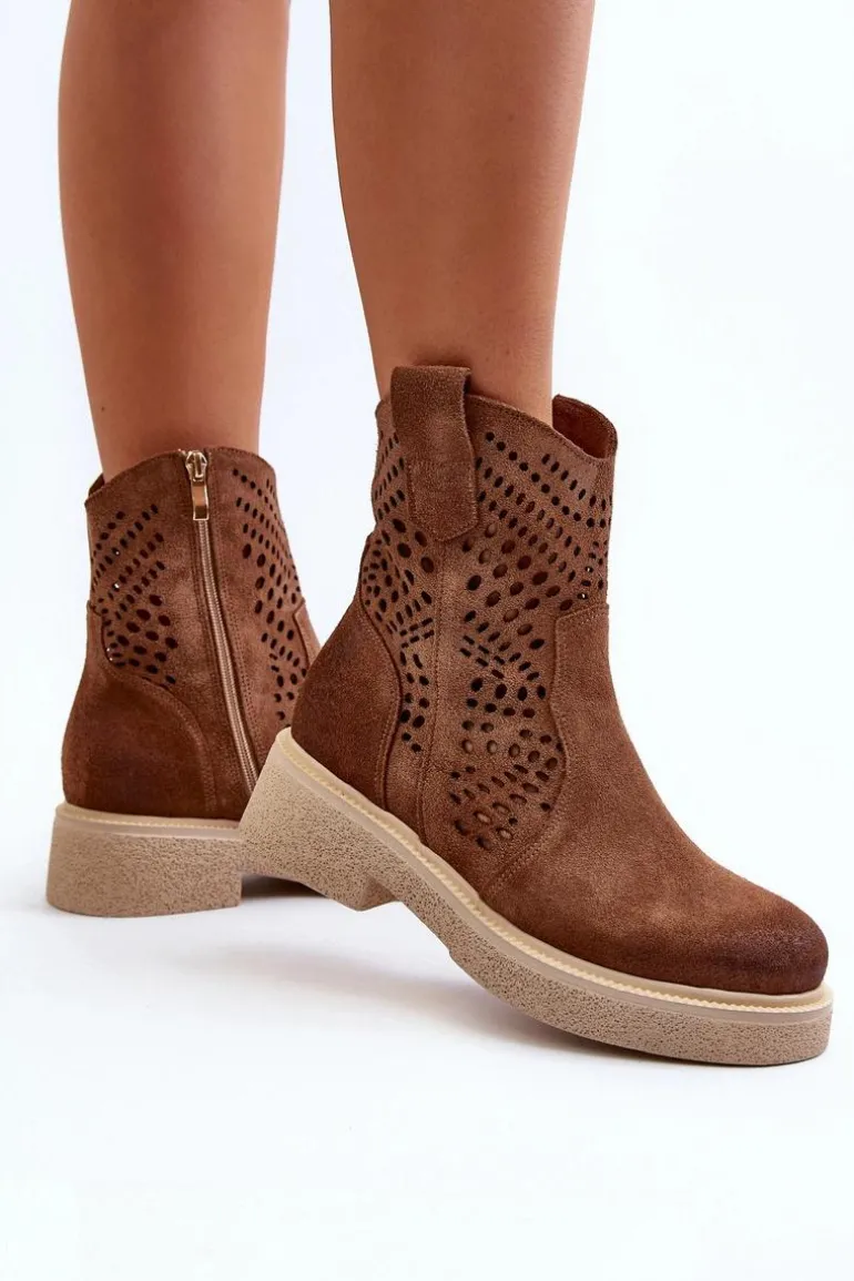 Zazoo 3470 Zamszowe Botki Damskie Na Płaskim Obcasie Ażurowe Brązowe