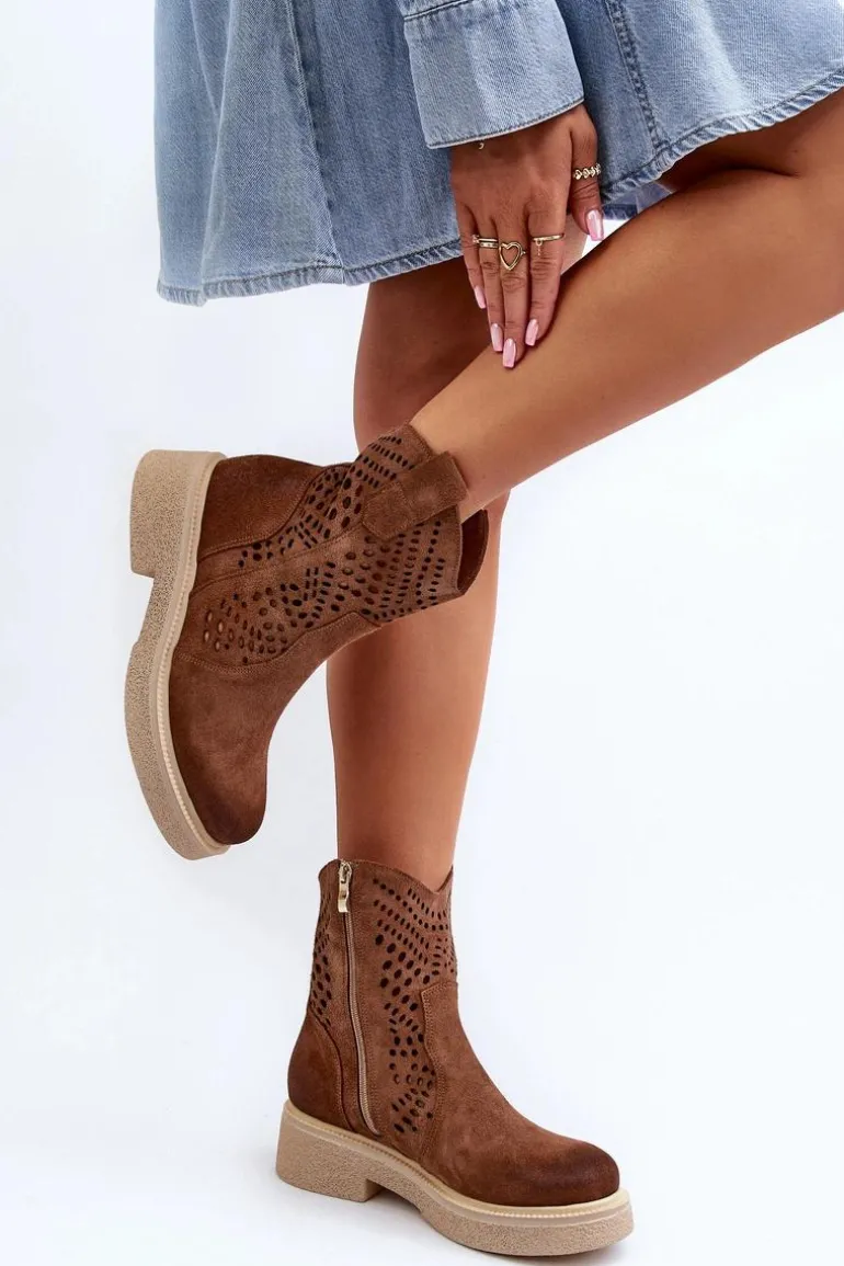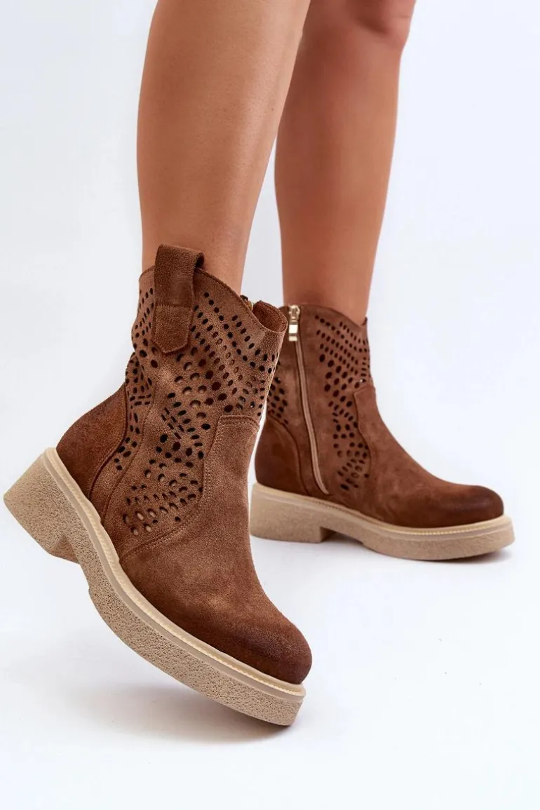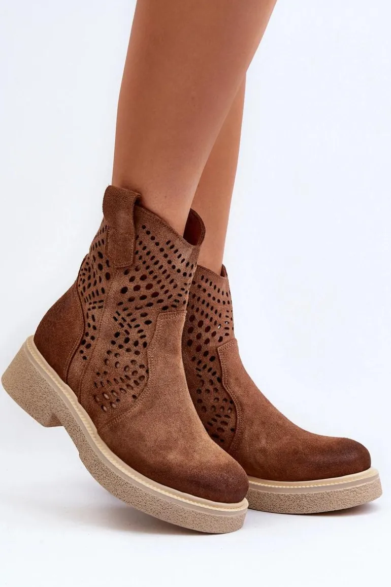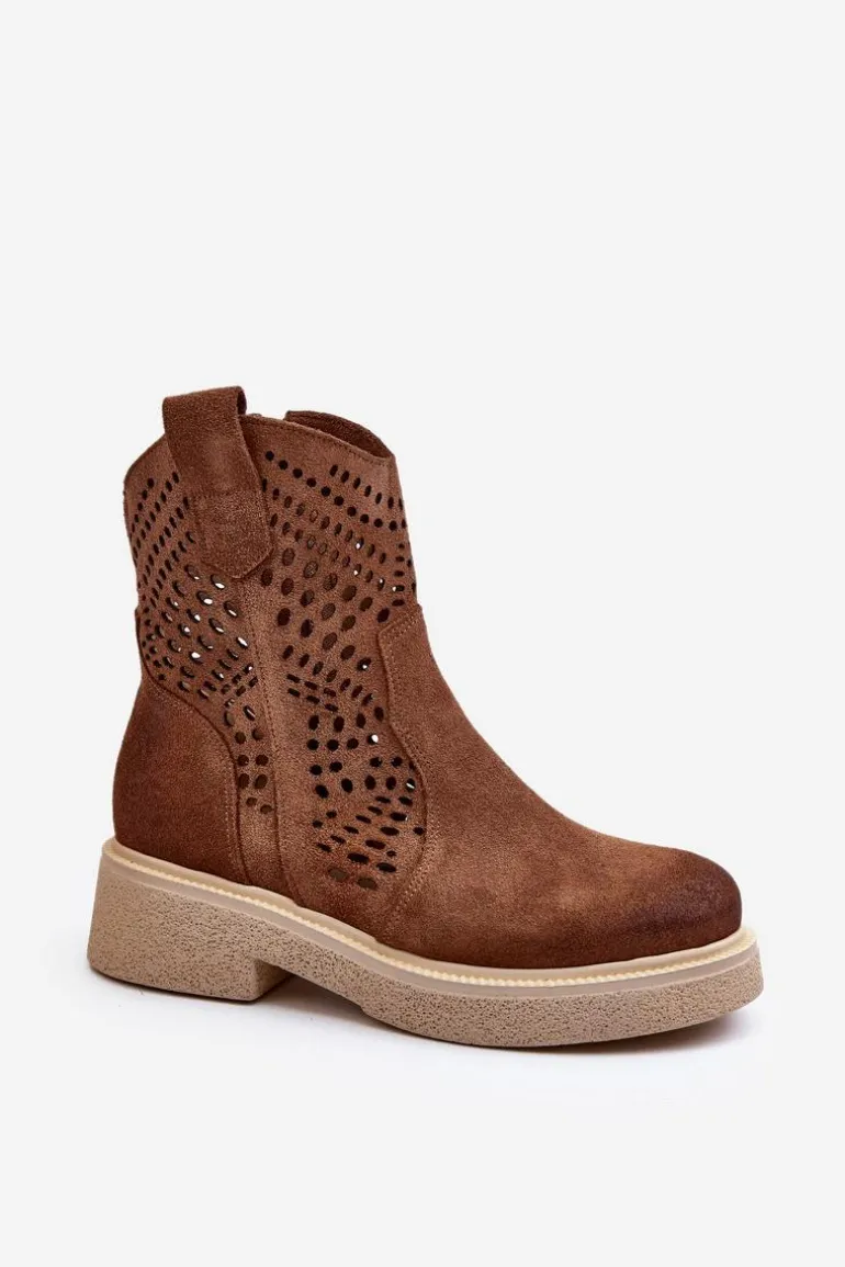 Zazoo 3470 Zamszowe Botki Damskie Na Płaskim Obcasie Ażurowe Brązowe