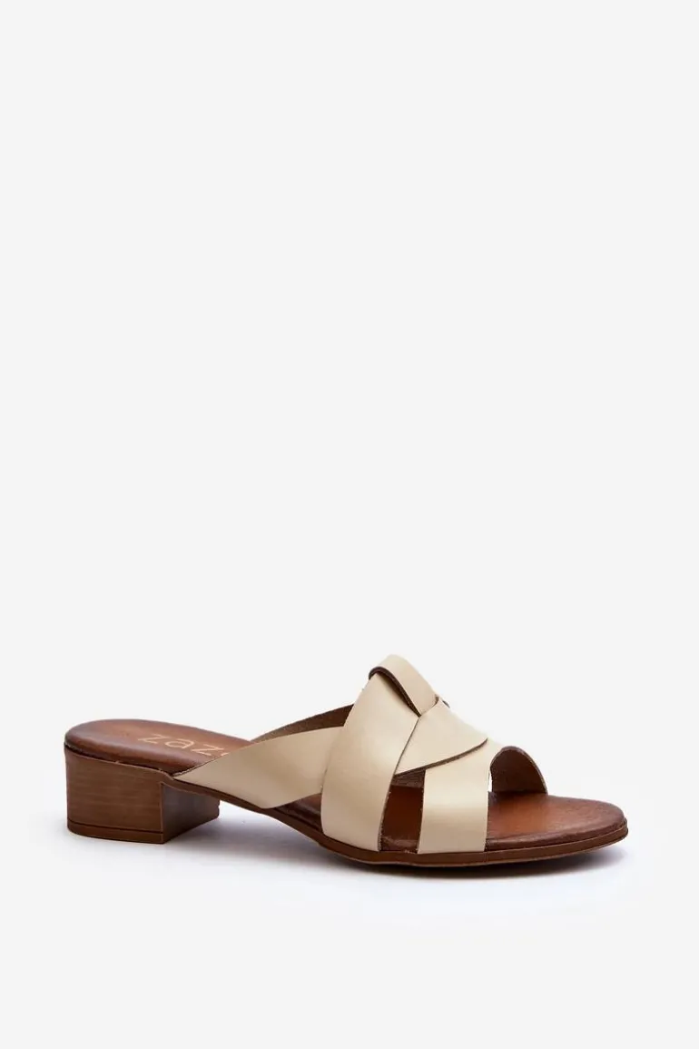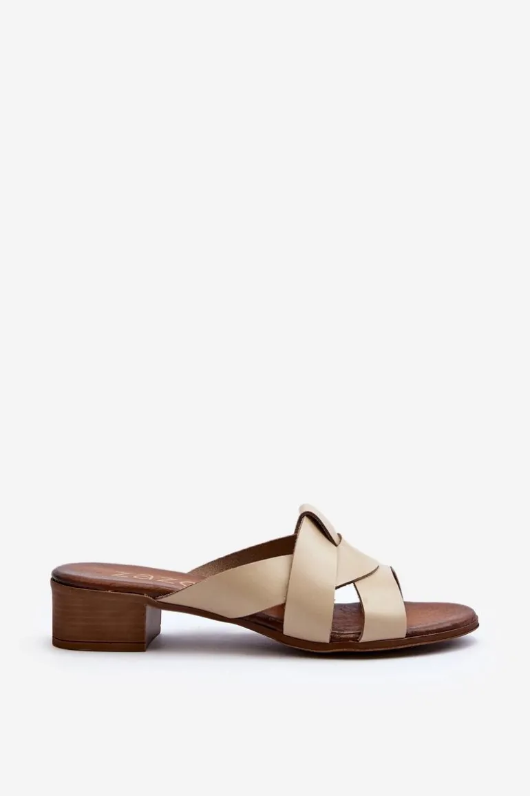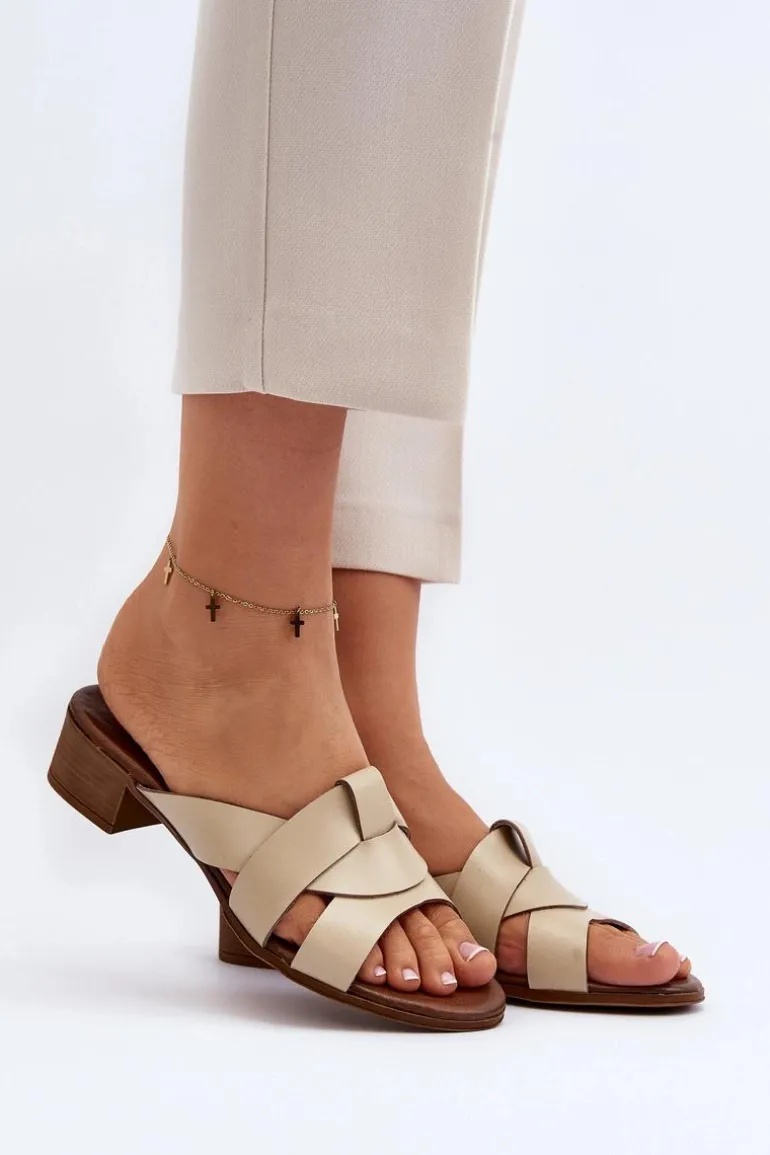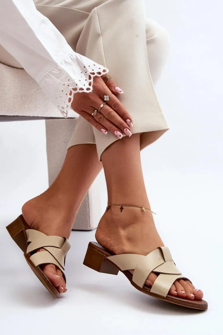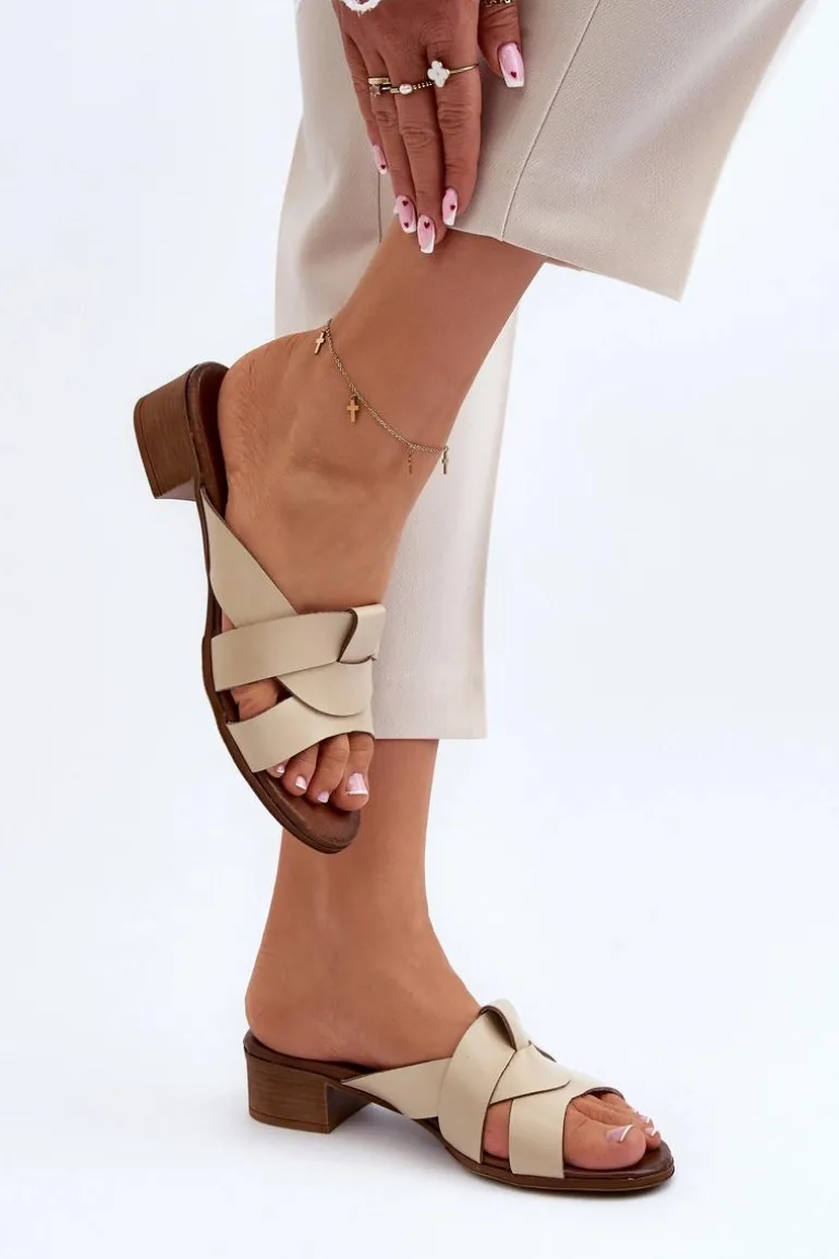 Klapki damskie wykonane ze skóry naturalnej. Osadzone na niskim obcasie. Skórzana wkładka zapewni wygodę podczas użytkowania. Świetnie sprawdzą się do wielu stylizacji. Spraw sobie radość kupując nową parę butów, które będą idealne na letnie dni! Przy wyborze rozmiaru prosimy sugerować się tabelą rozmiarów.