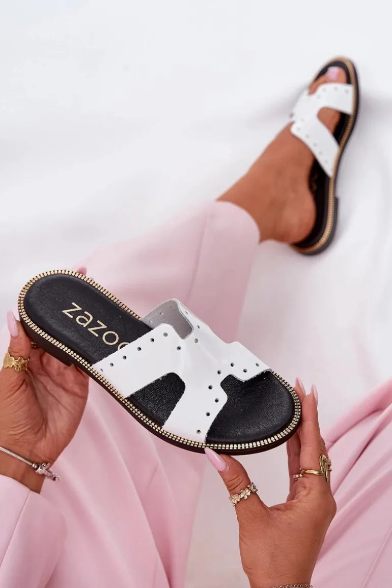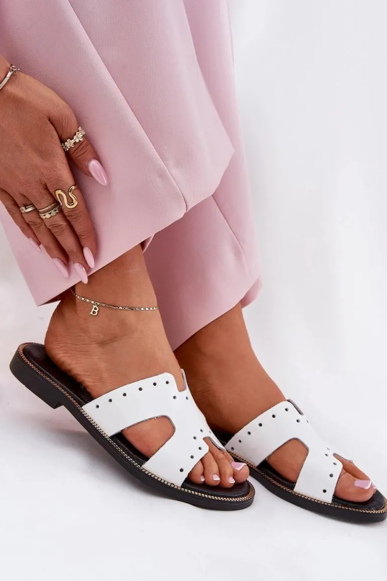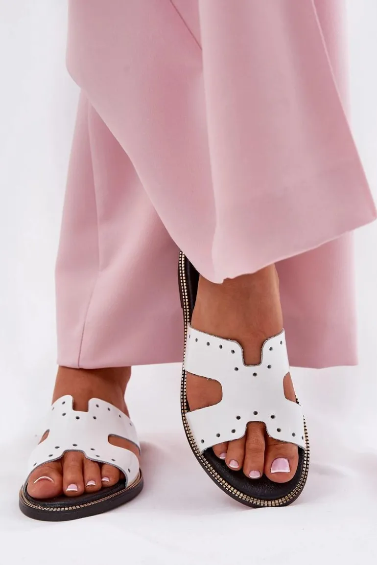 Damskie, klasyczne klapki zostały wykonane z naturalnej skóry z wycięciami. Osadzone na płaskim obcasie z ozdobioną podeszwą. Model ten z pewnością przypadnie do gustu każdej kobiecie ceniącej sobie styl oraz wygodę. Miękka, skórzana wkładka pozwoli na komfortowe użytkowanie obuwia nawet przez cały dzień. Przy wyborze rozmiaru prosimy sugerować się tabelą rozmiarów.
