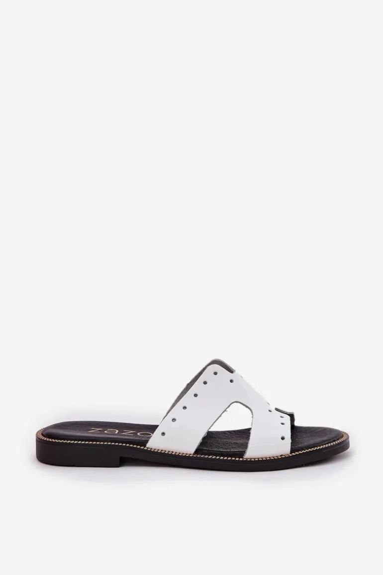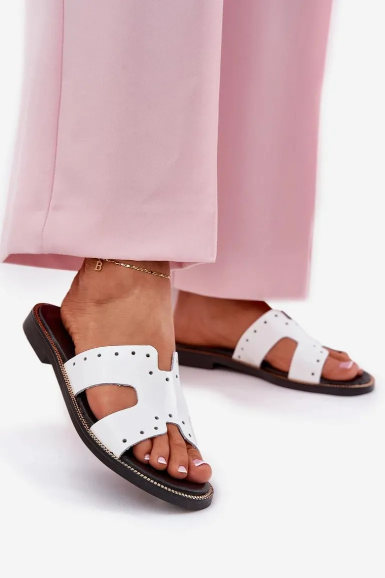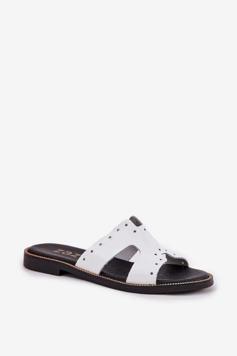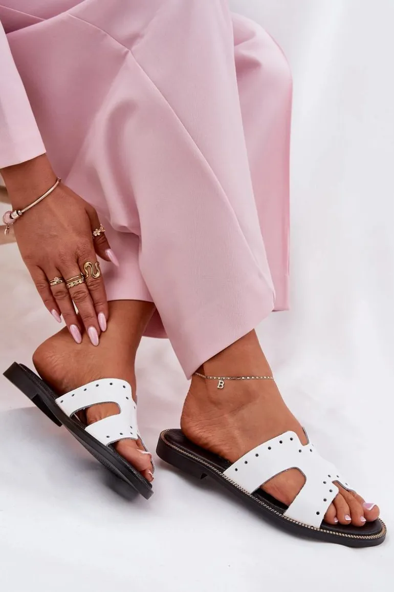 Damskie, klasyczne klapki zostały wykonane z naturalnej skóry z wycięciami. Osadzone na płaskim obcasie z ozdobioną podeszwą. Model ten z pewnością przypadnie do gustu każdej kobiecie ceniącej sobie styl oraz wygodę. Miękka, skórzana wkładka pozwoli na komfortowe użytkowanie obuwia nawet przez cały dzień. Przy wyborze rozmiaru prosimy sugerować się tabelą rozmiarów.