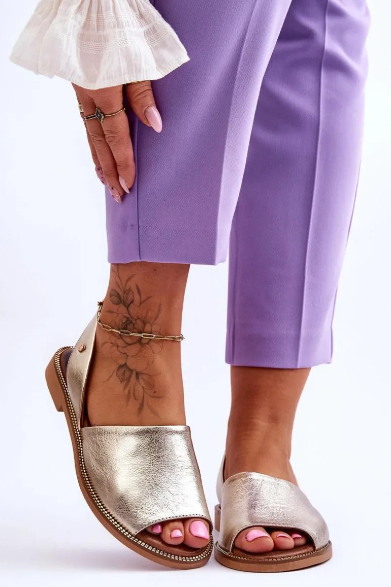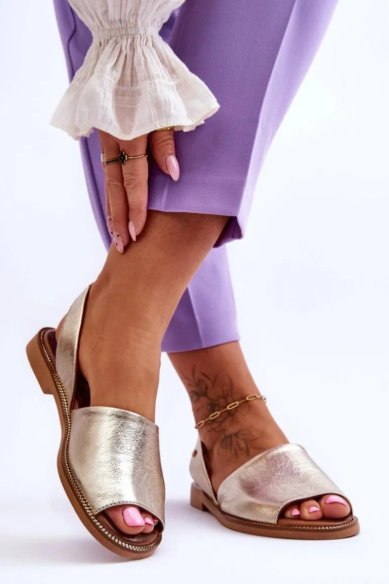 Wsuwane sandałki damskie zostały wykonane z wysokiej jakości naturalnej skóry. Osadzone na płaskim obcasie ze zdobieniami przy podeszwie. Sandałki posiadają odkrytą piętę i palce. Miękka, skórzana wkładka zapewni wygodne użytkowanie. Sandałki są wsuwane, a ich tylna część cholewki jest delikatnie usztywniona. Przy wyborze rozmiaru prosimy kierować się tabelą rozmiarów.