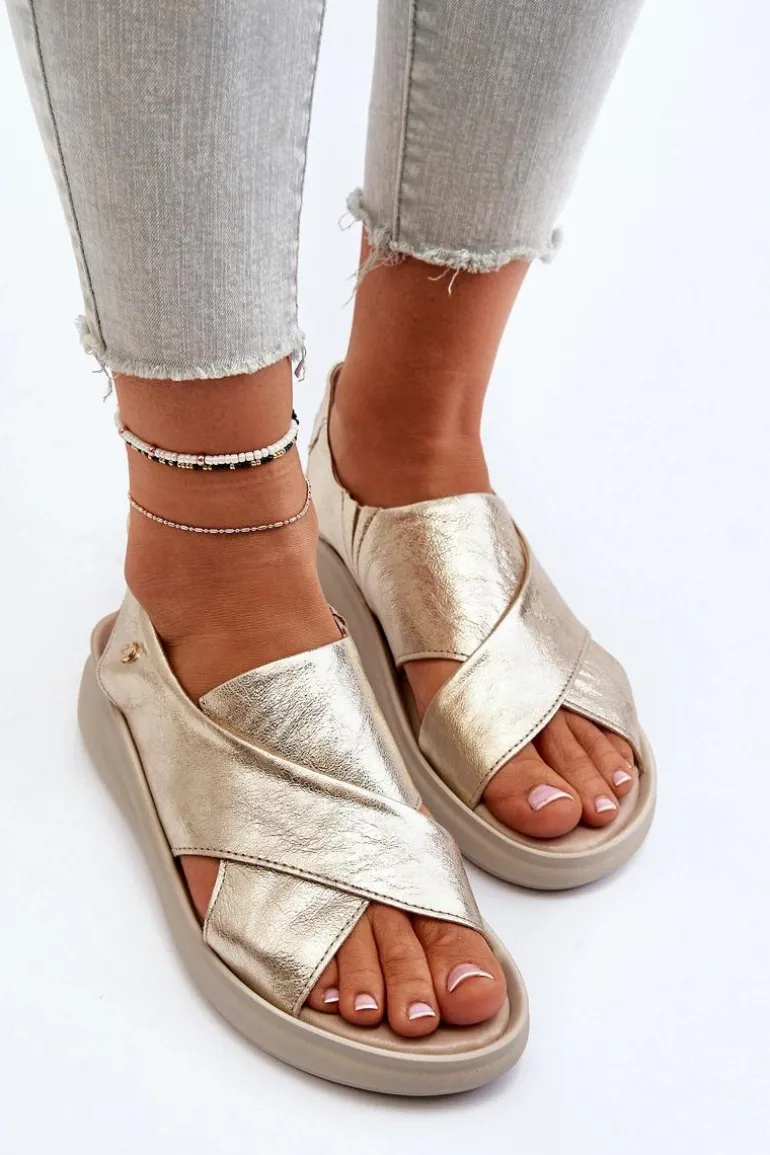 Te sandałki damskie to połączenie wygody i stylu, które z pewnością przypadnie Ci do gustu! Wykonane z naturalnej skóry, zapewniają trwałość i komfort noszenia. Model wsuwany, z dodatkową gumką. Ozdobny emblemat z boku cholewki dodaje im wyjątkowego charakteru, nadając im subtelny, elegancki akcent. Sandały zostały osadzone na platformie oraz lekkim koturnie, co nie tylko dodaje im stylowego wyglądu, ale także zapewnia stabilność i komfort podczas chodzenia. Model ten jest niezwykle praktycznym i modnym dodatkiem do letniej garderoby, idealnym zarówno na codzienne spacery, jak i na bardziej formalne okazje. Przy wyborze rozmiaru prosimy kierować się tabelą rozmiarów.