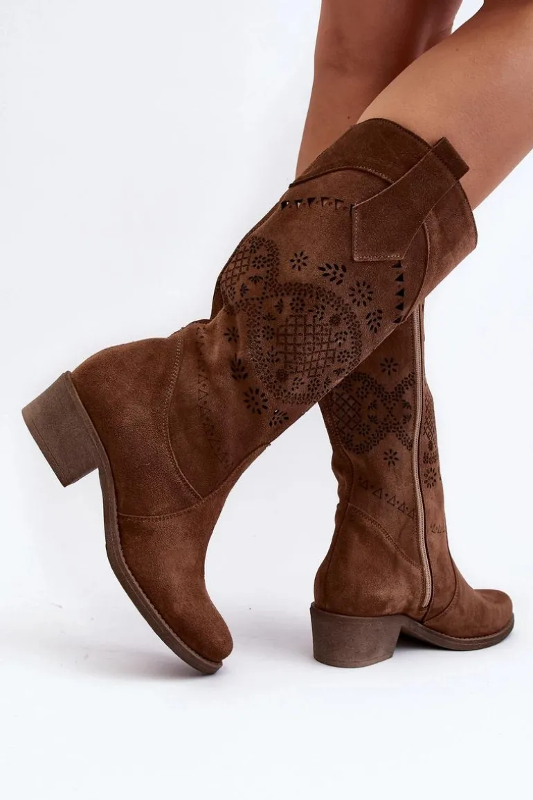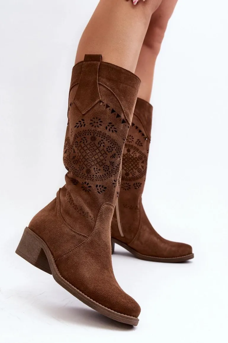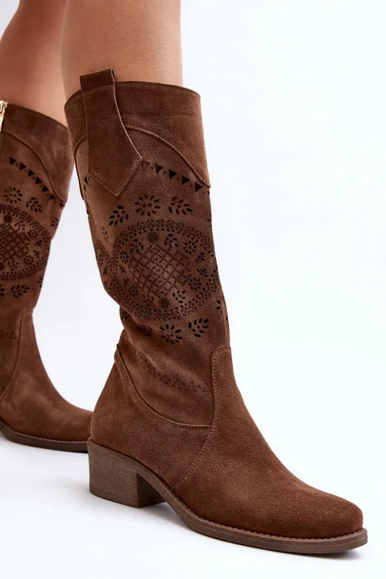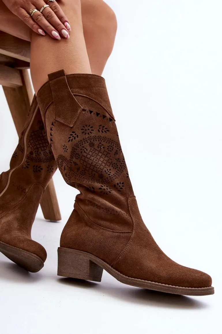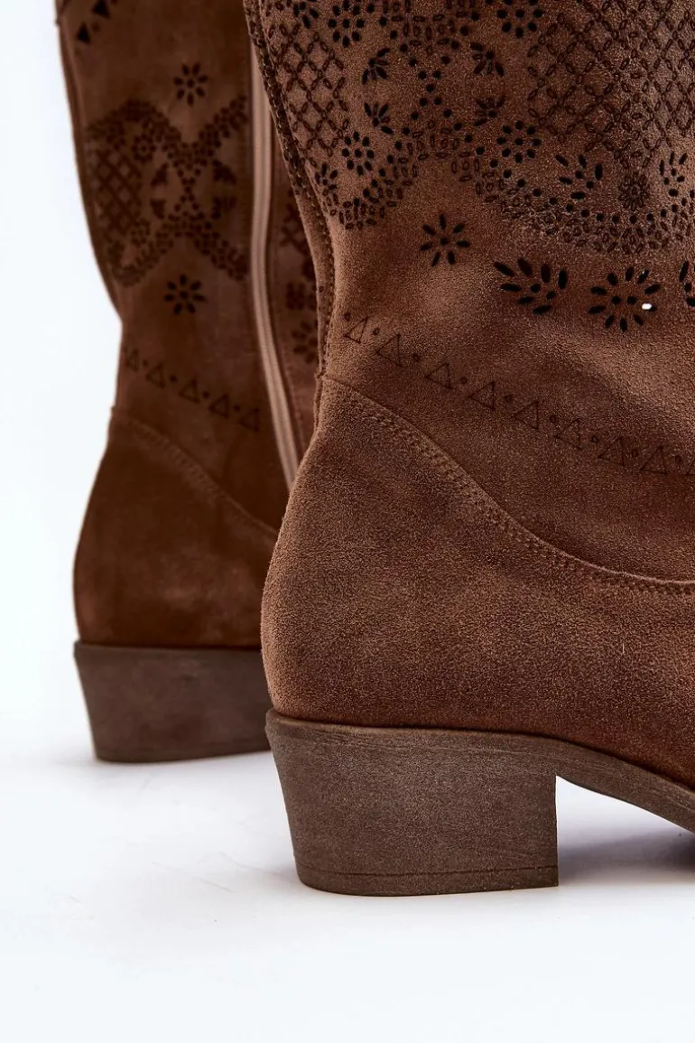Zazoo 4043 Zamszowe Kozaki Na Niskim Obcasie Ażurowe Brązowe