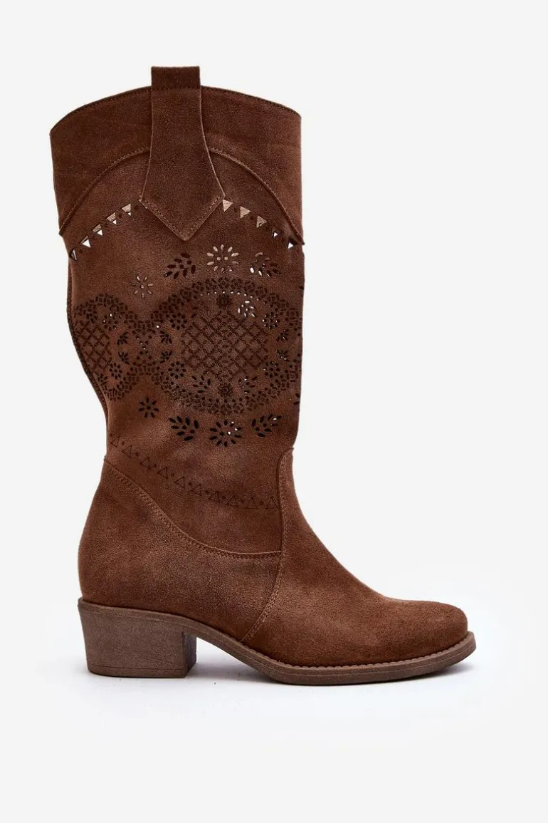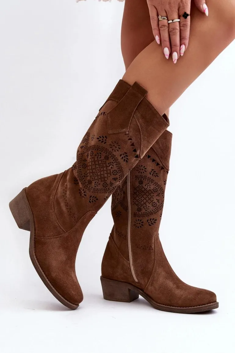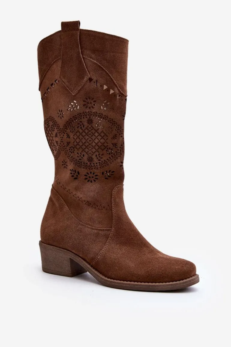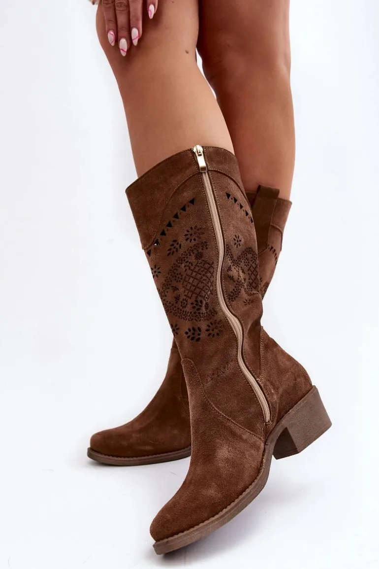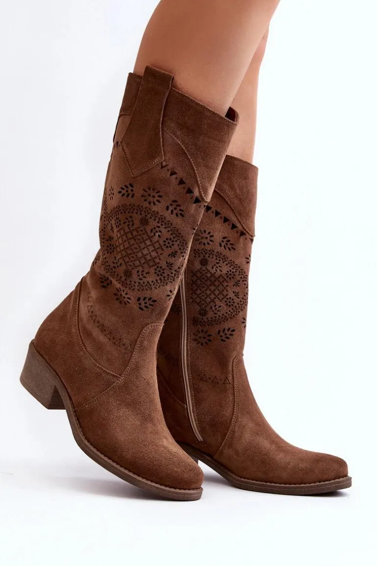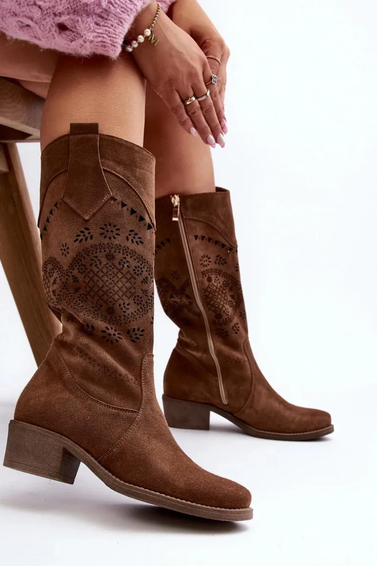 Zazoo 4043 Zamszowe Kozaki Na Niskim Obcasie Ażurowe Brązowe