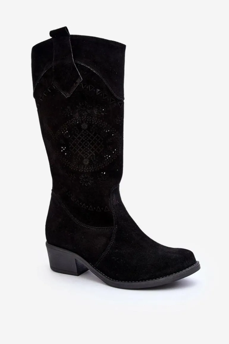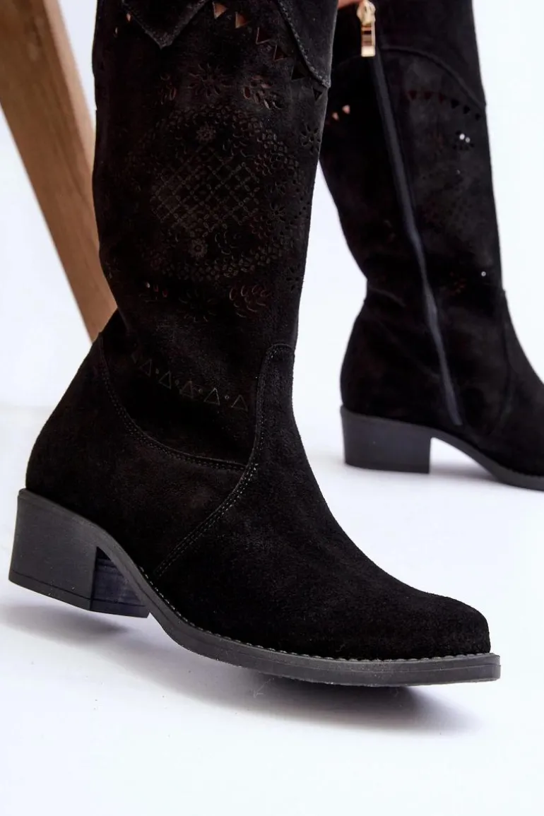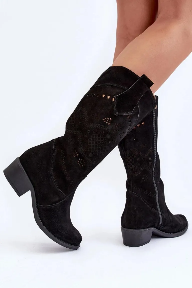 Ażurowe kozaki damskie idealnie dopełnią wiosenne stylizacje. Wykonane ze skóry naturalnej zamszowej. Osadzone na niskim obcasie. Cholewka do połowy łydki zapinana suwakiem. Noski w migdał. Miękka wkładka zapewni wygodę podczas użytkowania. Przy wyborze rozmiaru prosimy sugerować się tabelą rozmiarów.