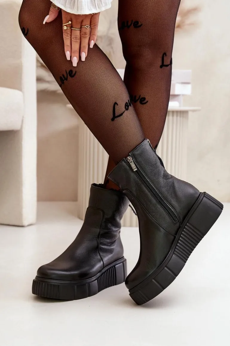 Botki damskie zostały wykonane z wysokiej jakości naturalnych skór. Osadzone na masywnej platformie z delikatnym koturnem. Zapinane z boku cholewki na suwak, natomiast suwak z tyłu jest ozdobny. Dodatkowo botki posiadają usztywniany zapiętek. Ocieplone w środku filcem. Model ten na pewno sprawdzi się w wielu jesiennych stylizacjach! Przy wyborze rozmiaru prosimy kierować się tabelą rozmiarów