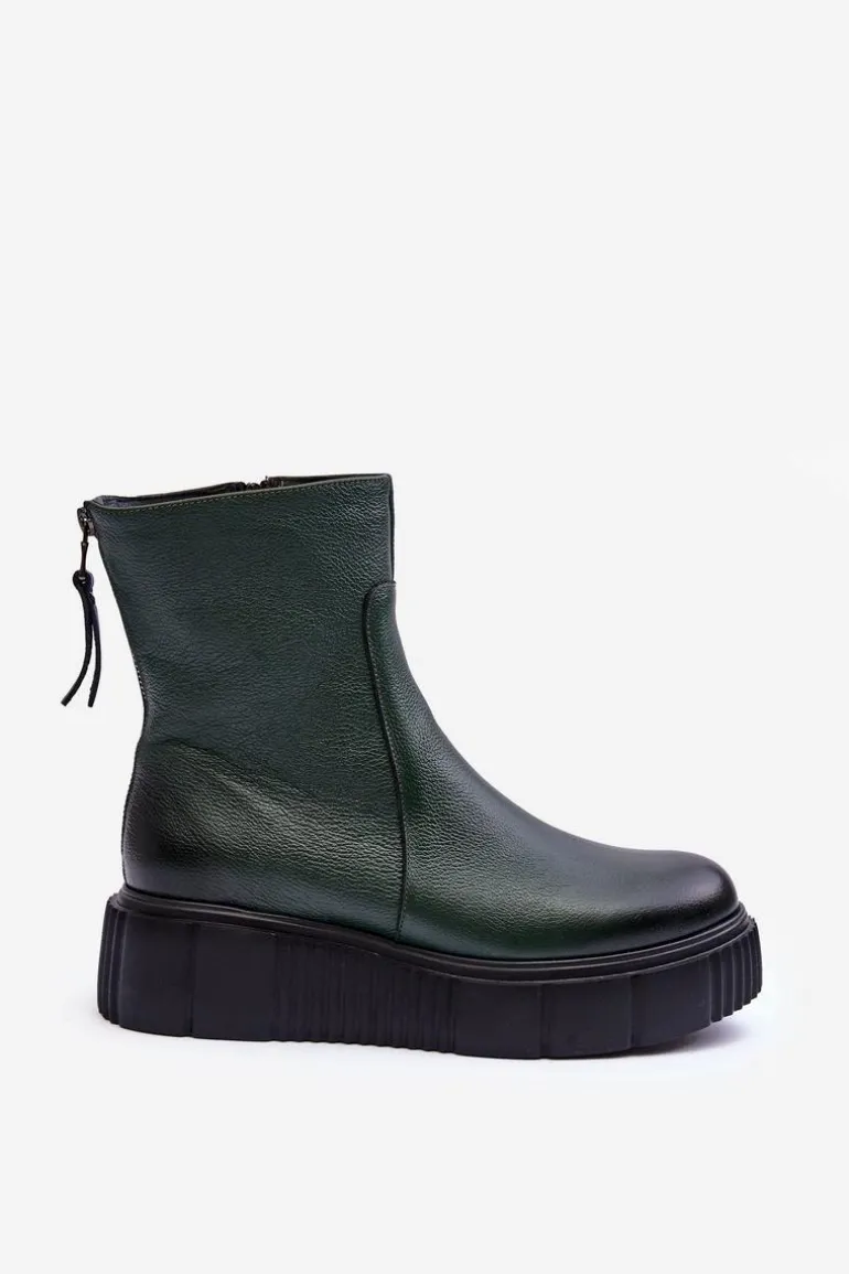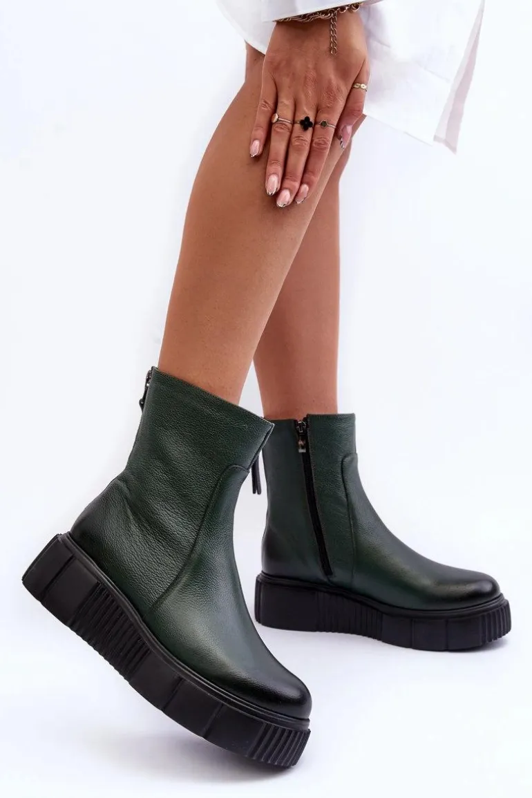 Botki damskie zostały wykonane z wysokiej jakości naturalnych skór. Osadzone na masywnej platformie z delikatnym koturnem. Zapinane z boku cholewki na suwak, natomiast suwak z tyłu jest ozdobny. Dodatkowo botki posiadają usztywniany zapiętek. Ocieplone w środku kocem obuwniczym. Model ten na pewno sprawdzi się w wielu jesiennych stylizacjach! Przy wyborze rozmiaru prosimy kierować się tabelą rozmiarów
