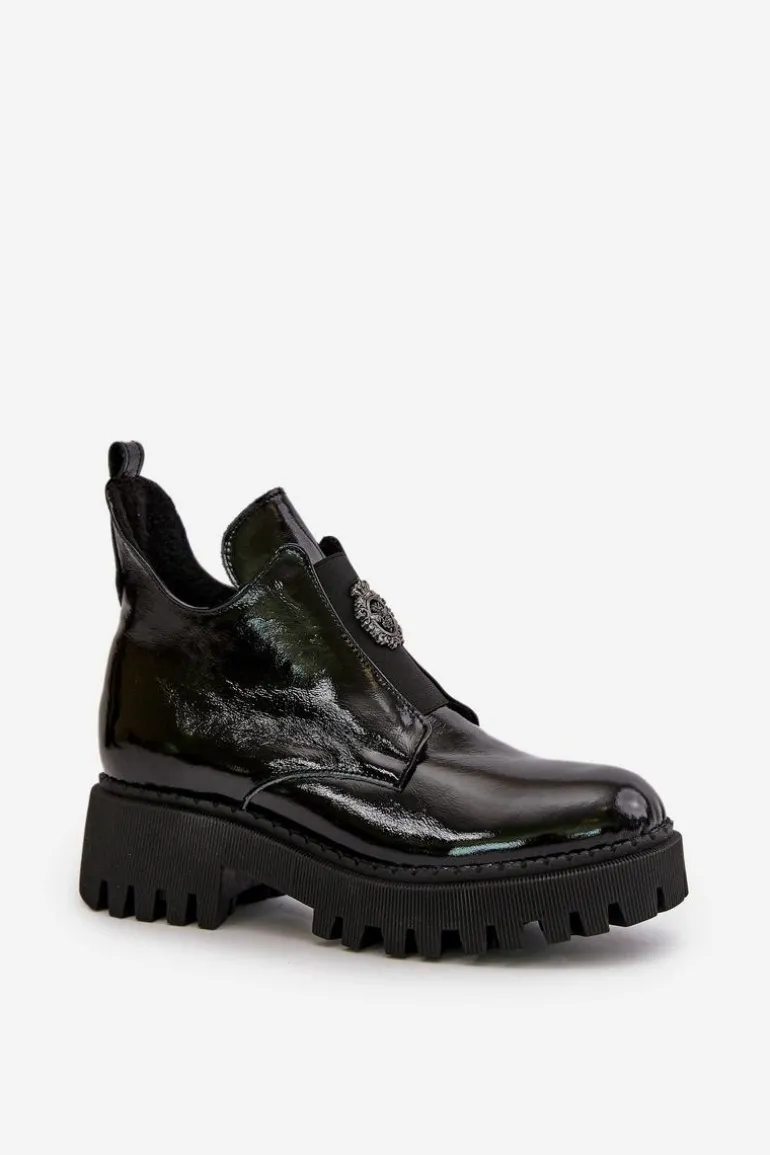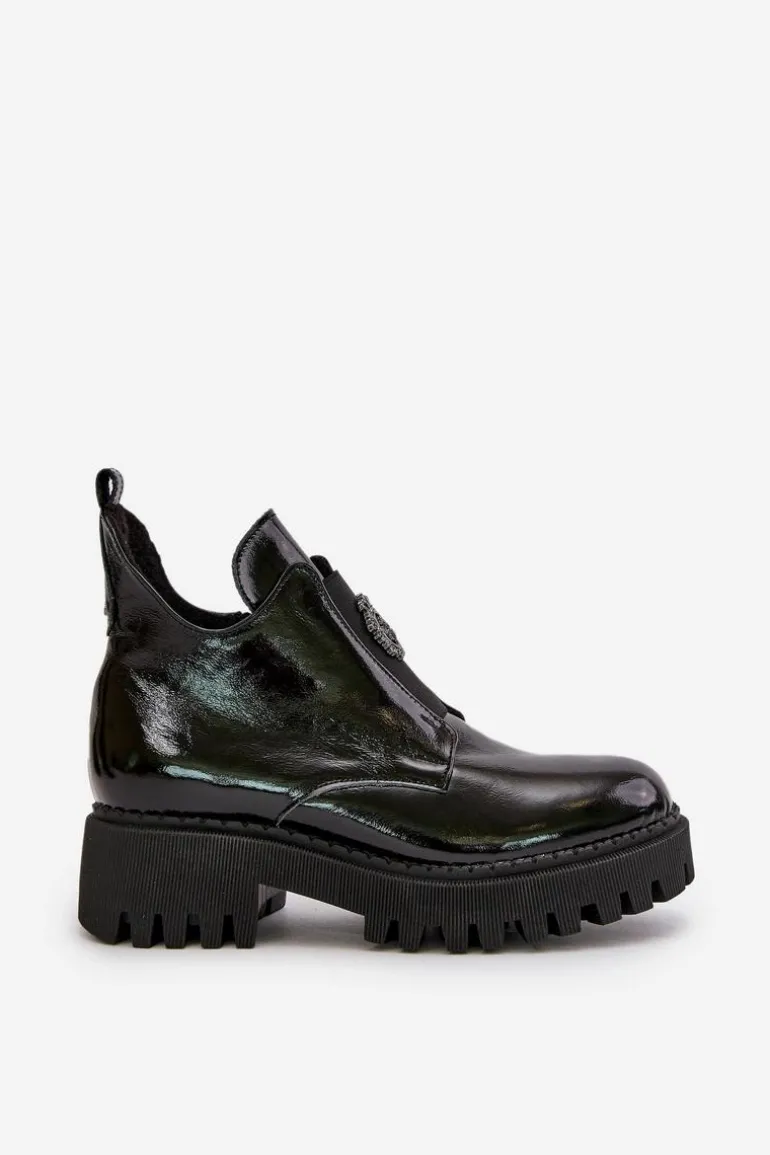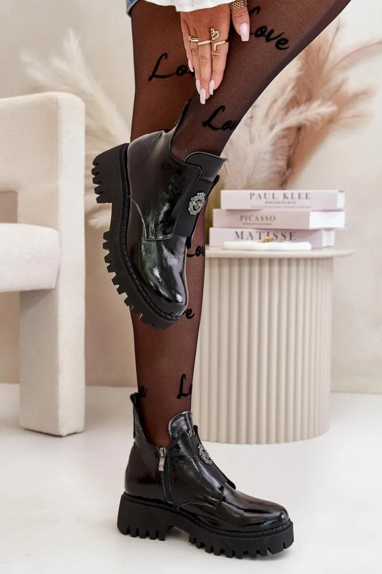 Damskie botki zostały wykonane z wysokiej jakości naturalnej skóry. Osadzone na masywnym obcasie i platformie ze żłobieniami. Model zapinany na suwak po wewnętrznej stronie cholewki. Z przodu na elastycznej wstawce znajduje się ozdoba z tworzywa sztucznego. Wnętrze ocieplone kocem obuwniczym. Ten wyjątkowy model wzbogaci wiele Twoich stylizacji! Przy wyborze rozmiaru prosimy sugerować się tabelą rozmiarów.
