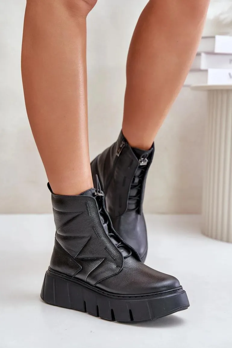 Damskie botki wykonane z naturalnej skóry, osadzone na platformie i koturnie, to idealny wybór na chłodniejsze dni. Ocieplane filcem, zapewniają ciepło i komfort noszenia. Model zapinany na zamek ułatwia zakładanie, a elegancki design sprawia, że botki doskonale pasują zarówno do codziennych, jak i bardziej stylowych stylizacji. Przy wyborze rozmiaru prosimy kierować się tabelą rozmiarów