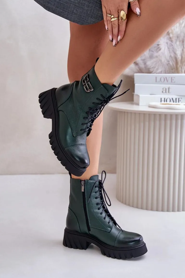 Botki damskie wykonane ze skóry naturalnej. Osadzone na masywnym, płaskim obcasie i platformie. Posiadają zarówno sznurowanie, jak i zamek, co zapewnia wygodę zakładania i dopasowanie do stopy. Z boku cholewki ozdobny, złoty detal, który dodaje elegancji. Wnętrze ocieplone kocem obuwniczym. Idealne do jesiennych i zimowych stylizacji, te botki łączą elegancję z funkcjonalnością. Przy wyborze rozmiaru prosimy kierować się tabelą rozmiarów