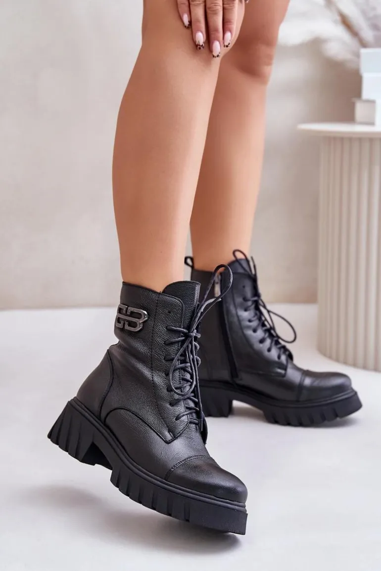 Botki damskie wykonane ze skóry naturalnej. Osadzone na masywnym, płaskim obcasie i platformie. Posiadają zarówno sznurowanie, jak i zamek, co zapewnia wygodę zakładania i dopasowanie do stopy. Z boku cholewki ozdobny, złoty detal, który dodaje elegancji. Wnętrze ocieplone kocem obuwniczym. Idealne do jesiennych i zimowych stylizacji, te botki łączą elegancję z funkcjonalnością. Przy wyborze rozmiaru prosimy kierować się tabelą rozmiarów