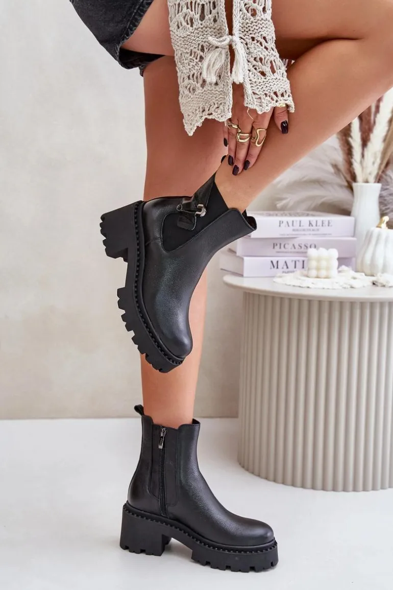 Botki wykonane z wysokiej jakości skóry naturalnej. Zapinane na zamek. Ocieplane filcem, co zapewnia komfort w chłodne dni. Model posiada zaokrąglone noski i osadzony jest na masywnym obcasie, co dodaje stabilności. Głównym atutem jest ozdoba w postaci agrafki. Przy wyborze rozmiaru prosimy kierować się tabelą rozmiarów