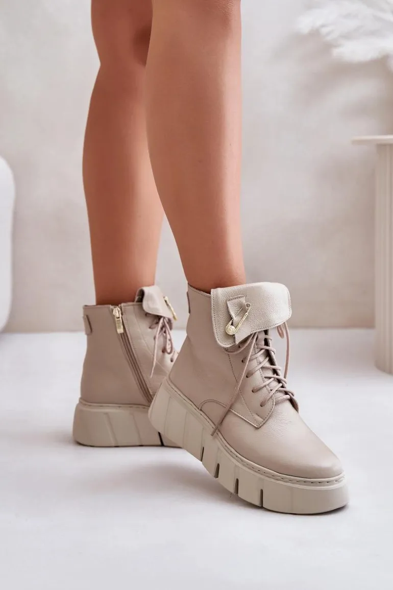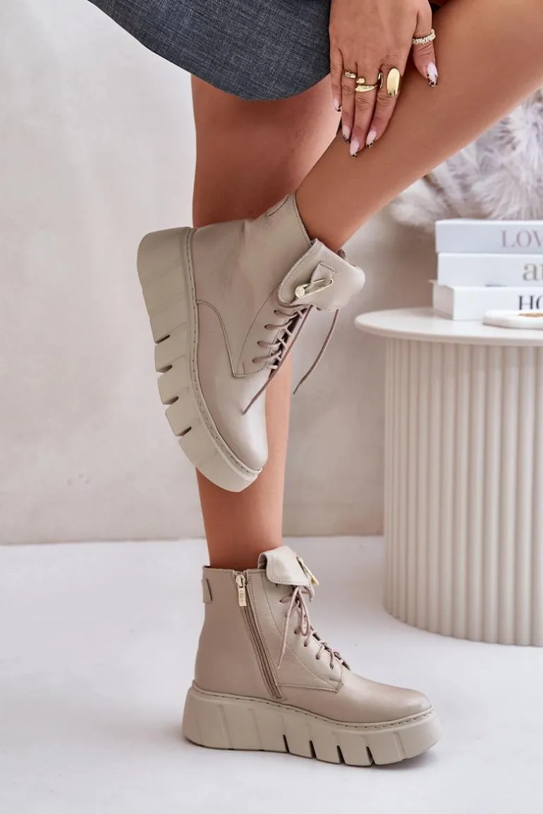 Damskie botki ze skóry naturalnej na platformie to idealne połączenie stylu i funkcjonalności. Posiadają zarówno sznurowanie, jak i zamek, co zapewnia wygodę zakładania i dopasowanie do stopy. Zaokrąglone noski dodają subtelności, a ozdoba w postaci agrafki wprowadza unikalny akcent. Wnętrze ocieplone kocem obuwniczym gwarantuje ciepło i komfort, sprawiając, że są doskonałym wyborem na chłodniejsze dni. Przy wyborze rozmiaru prosimy kierować się tabelą rozmiarów