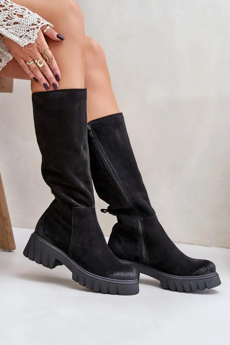 Stylowe damskie kozaki są wykonane z najwyższej jakości naturalnej skóry zamszowej. Ten model charakteryzuje się bocznym suwakiem na cholewce. Kozaki mają noski zaokrąglone i są osadzone na platformie i płaskim obcasie. Wnętrze jest ocieplane filcem, co zapewnia dodatkowy komfort termiczny. Te kozaki to niezbędny element każdej garderoby! Przy wyborze rozmiaru prosimy kierować tabelą rozmiarów.