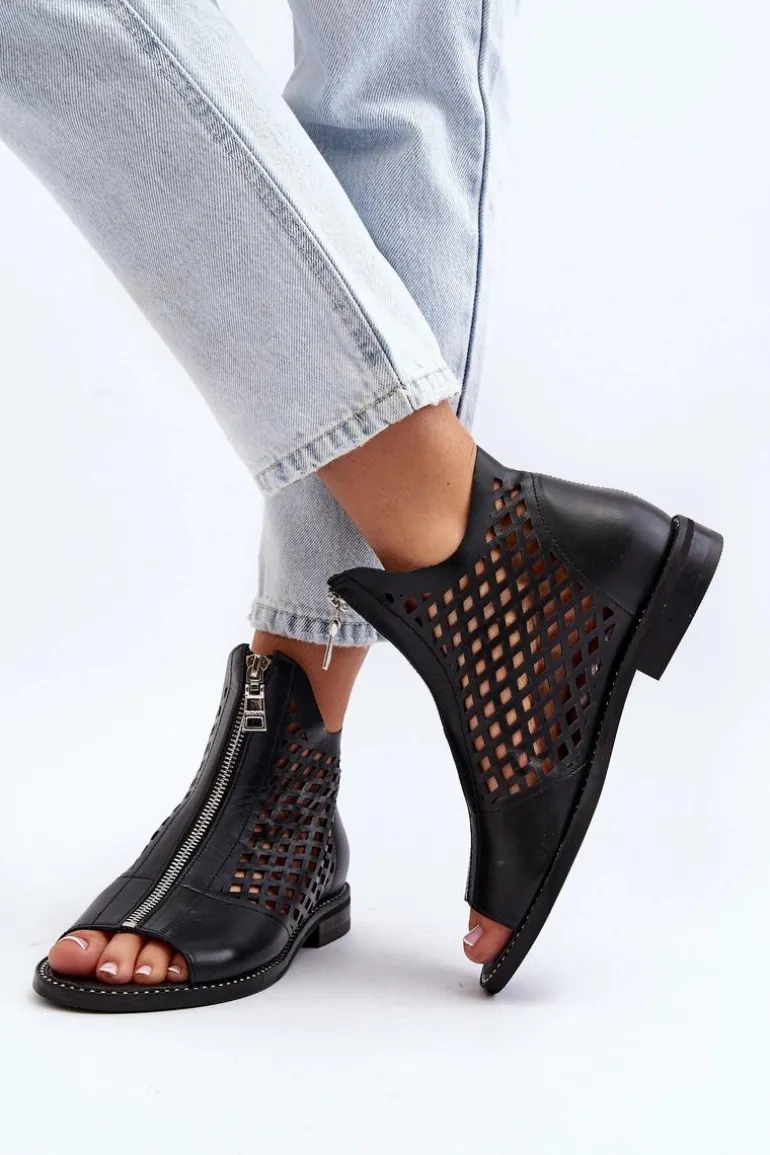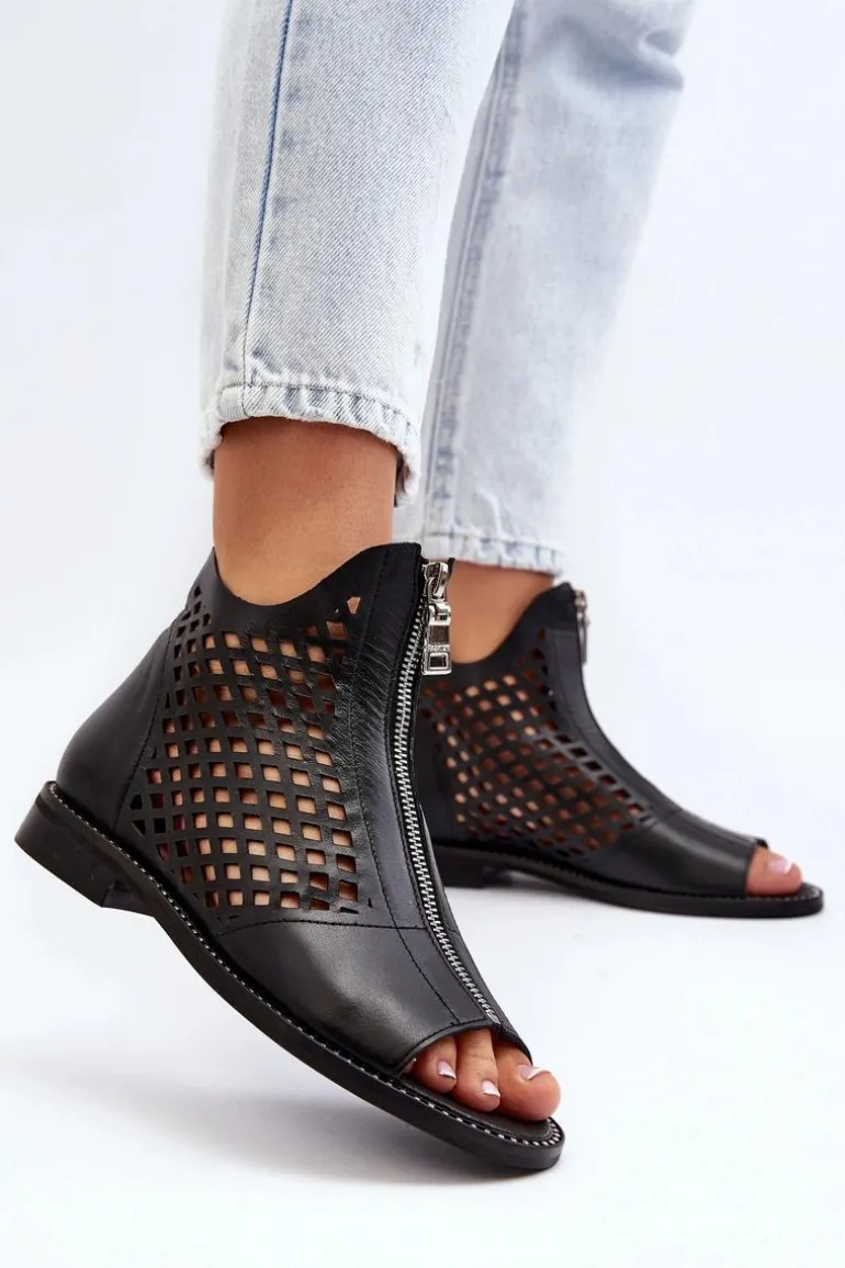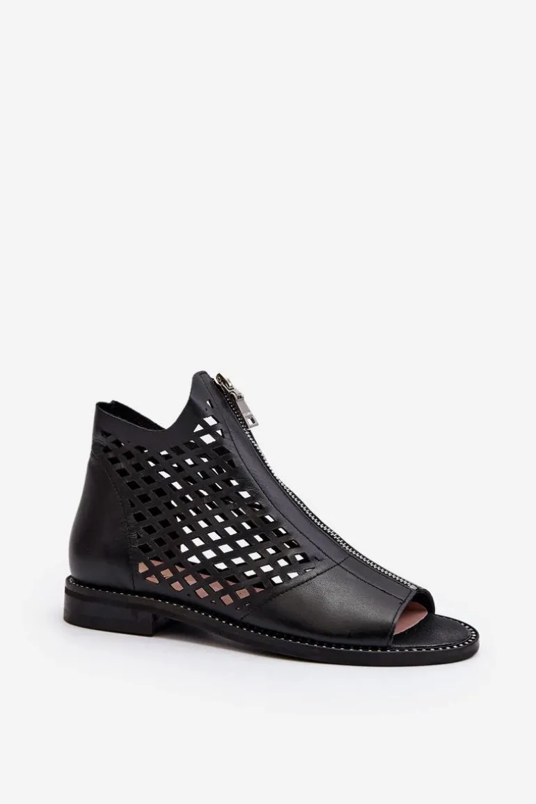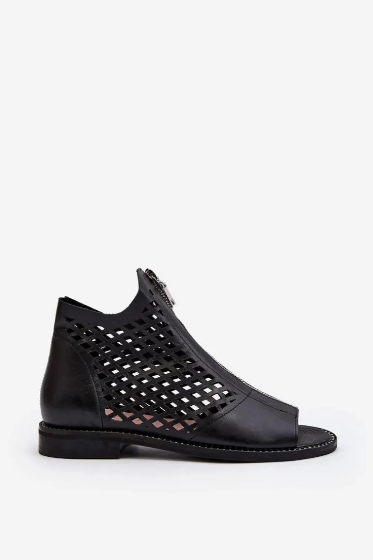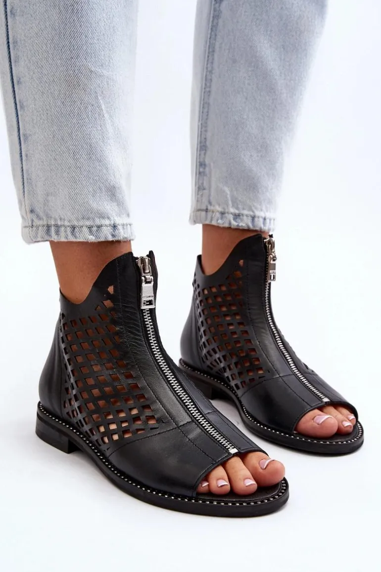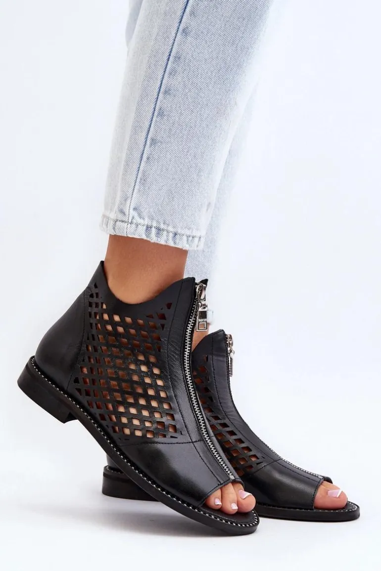 Zazoo 977/L Skórzane Ażurowe Sandały Na Zamek Czarne