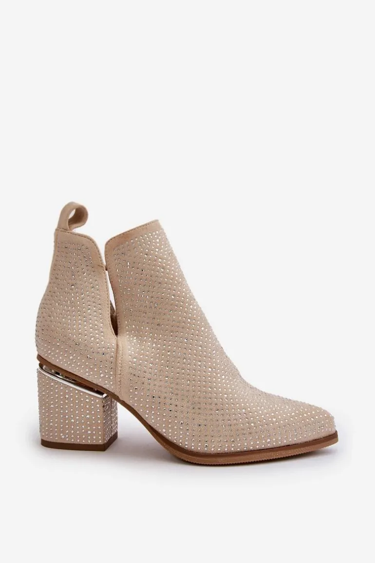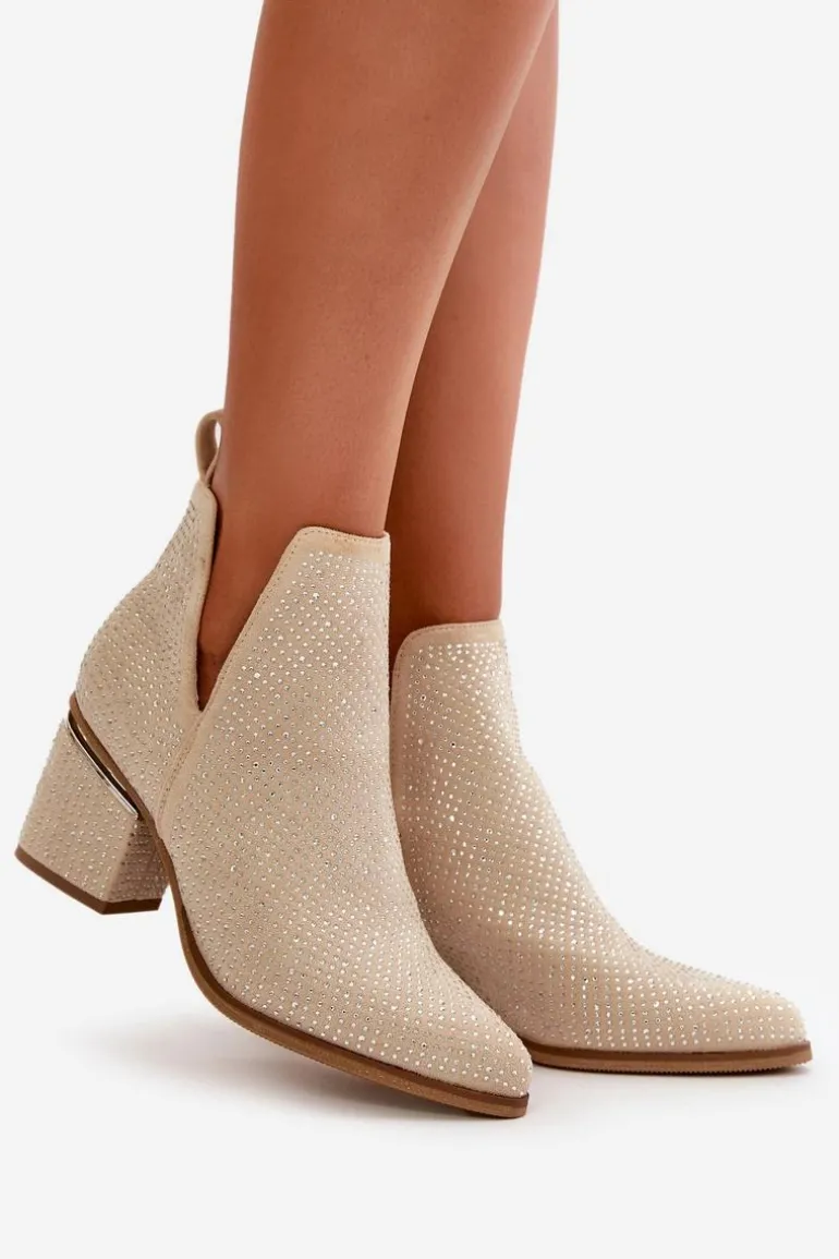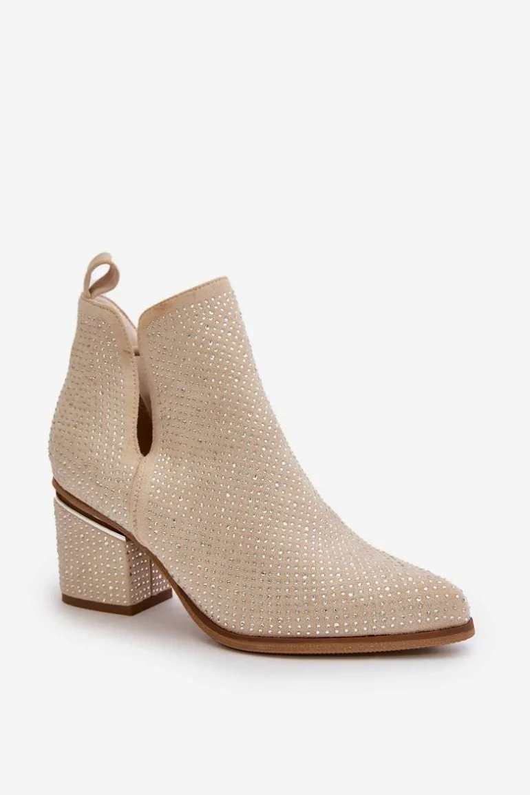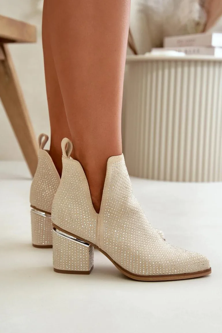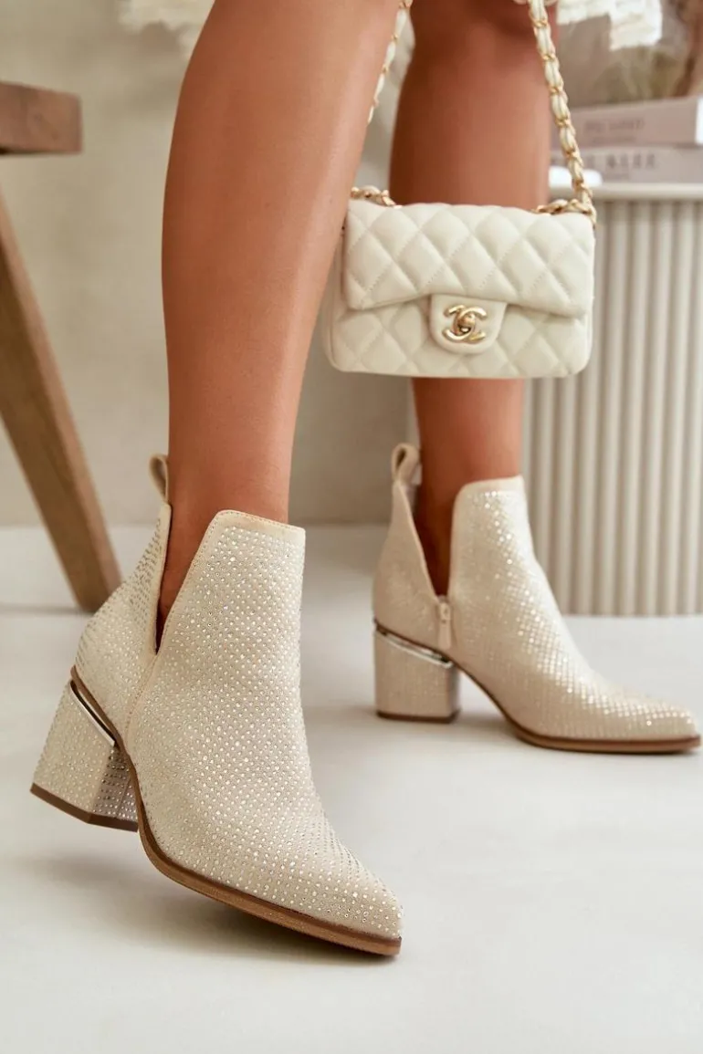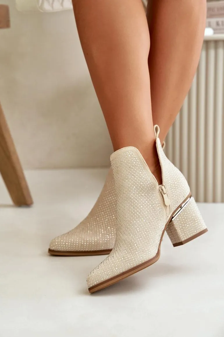 Zdobione Botki Damskie Na Obcasie Z Noskami W Szpic Beżowe Fararia