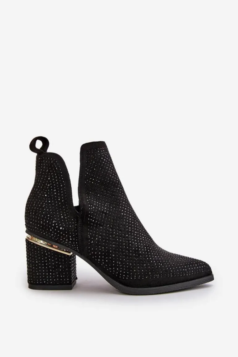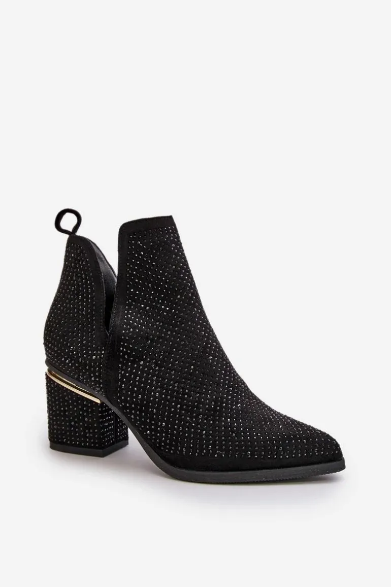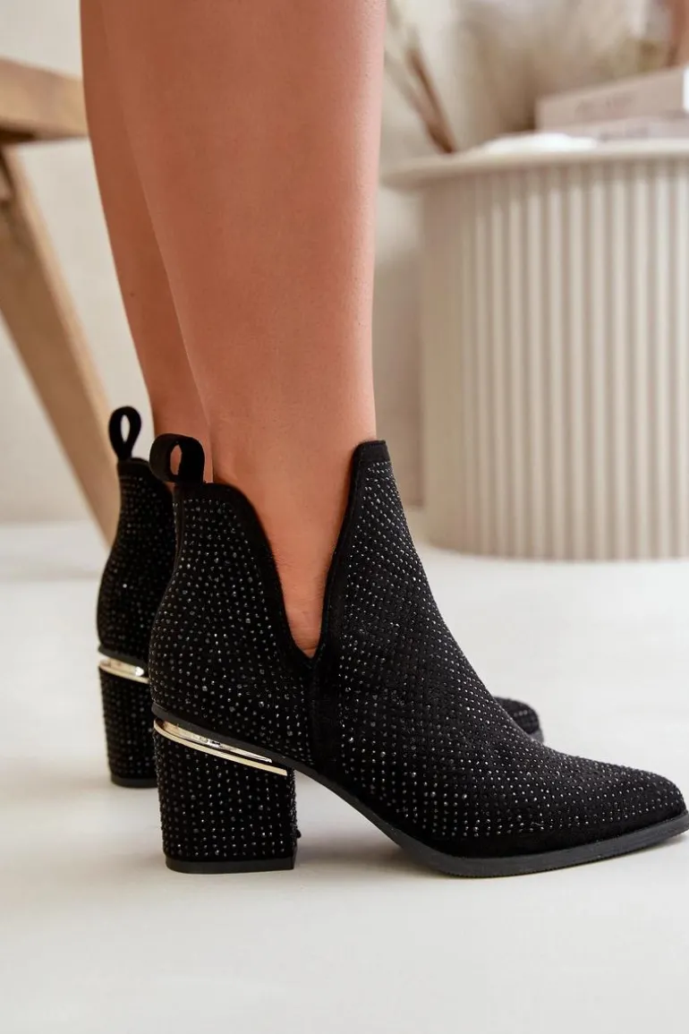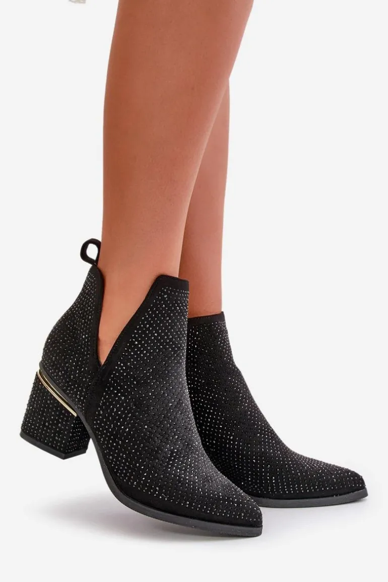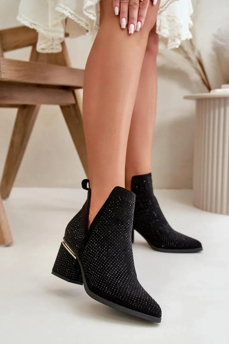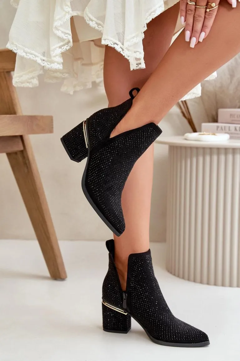 Zdobione botki damskie wykonane z eko zamszu. Cholewka z wycięciami, zapinana na zamek, nadaje im unikalnego charakteru. Osadzone na stabilnym obcasie typu słupek, z noskami w szpic, te botki łączą elegancję z nowoczesnym stylem, idealnie komponując się z różnymi stylizacjami. Przy wyborze rozmiaru prosimy sugerować się tabelą rozmiarów.