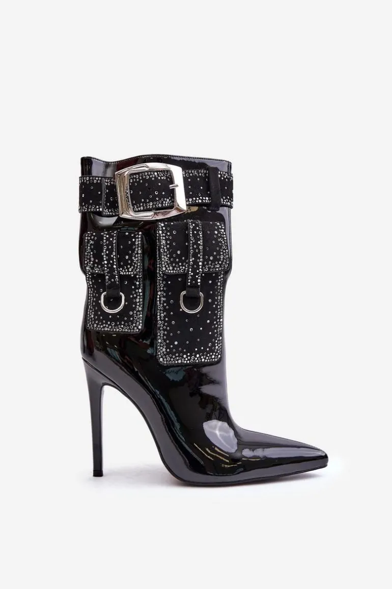 Zdobione Botki Z Lakierowanej Eko Skóry Na Szpilce Czarne Senorith