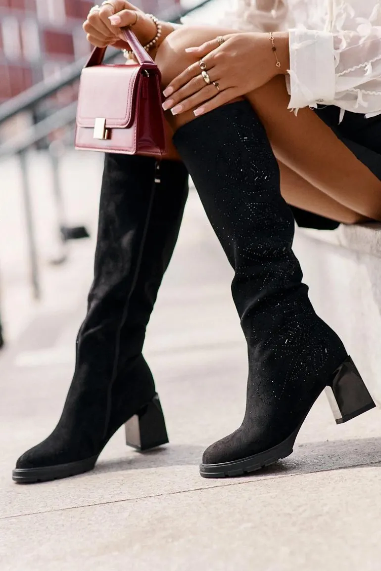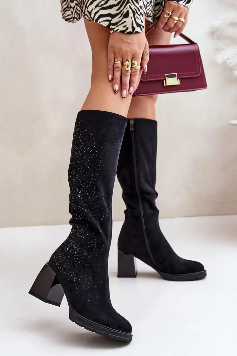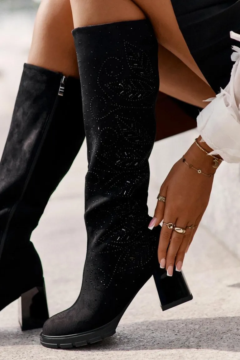 Kozaki damskie wykonane z wysokiej jakości eko zamszu. Osadzone na obcasie w formie słupka. Głównym atutem tego modelu jest zdobienie na cholewce. Noski zaokrąglone. Środek ocieplony kocem obuwniczym. Cholewka sięga przed kolano. Przy wyborze rozmiaru prosimy sugerować się tabelą rozmiarów.