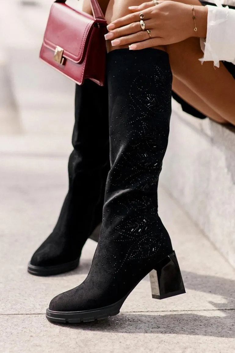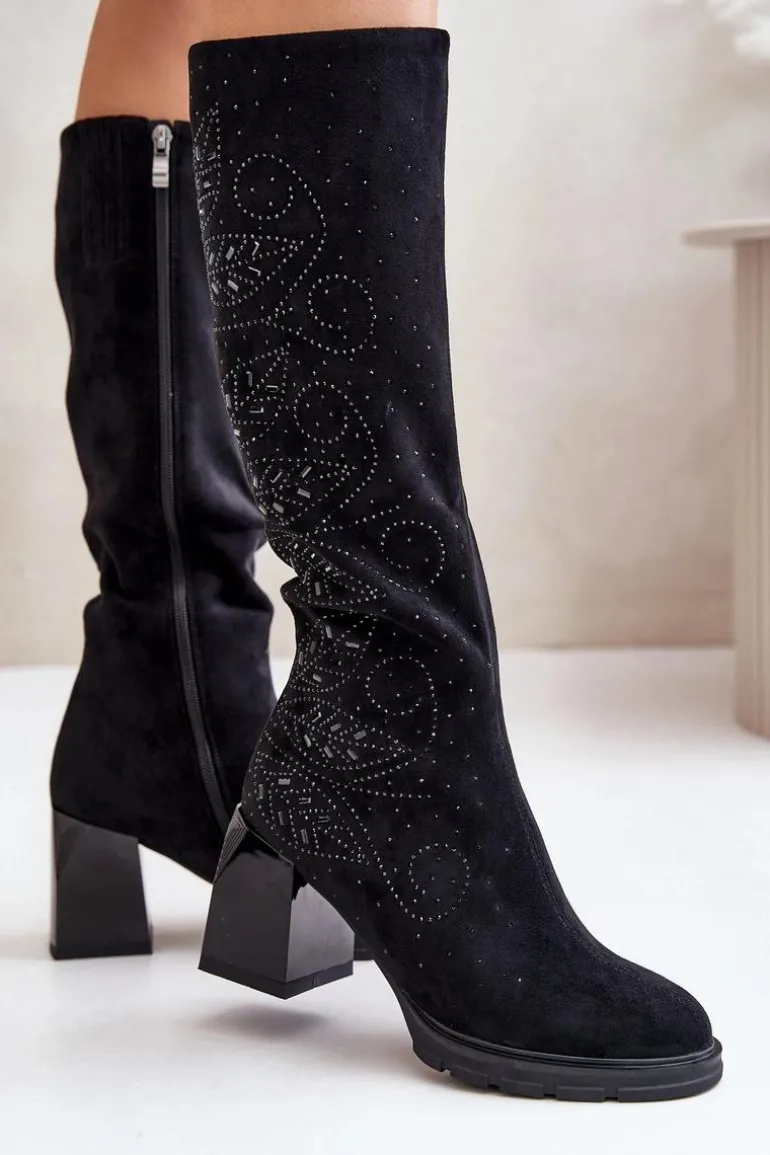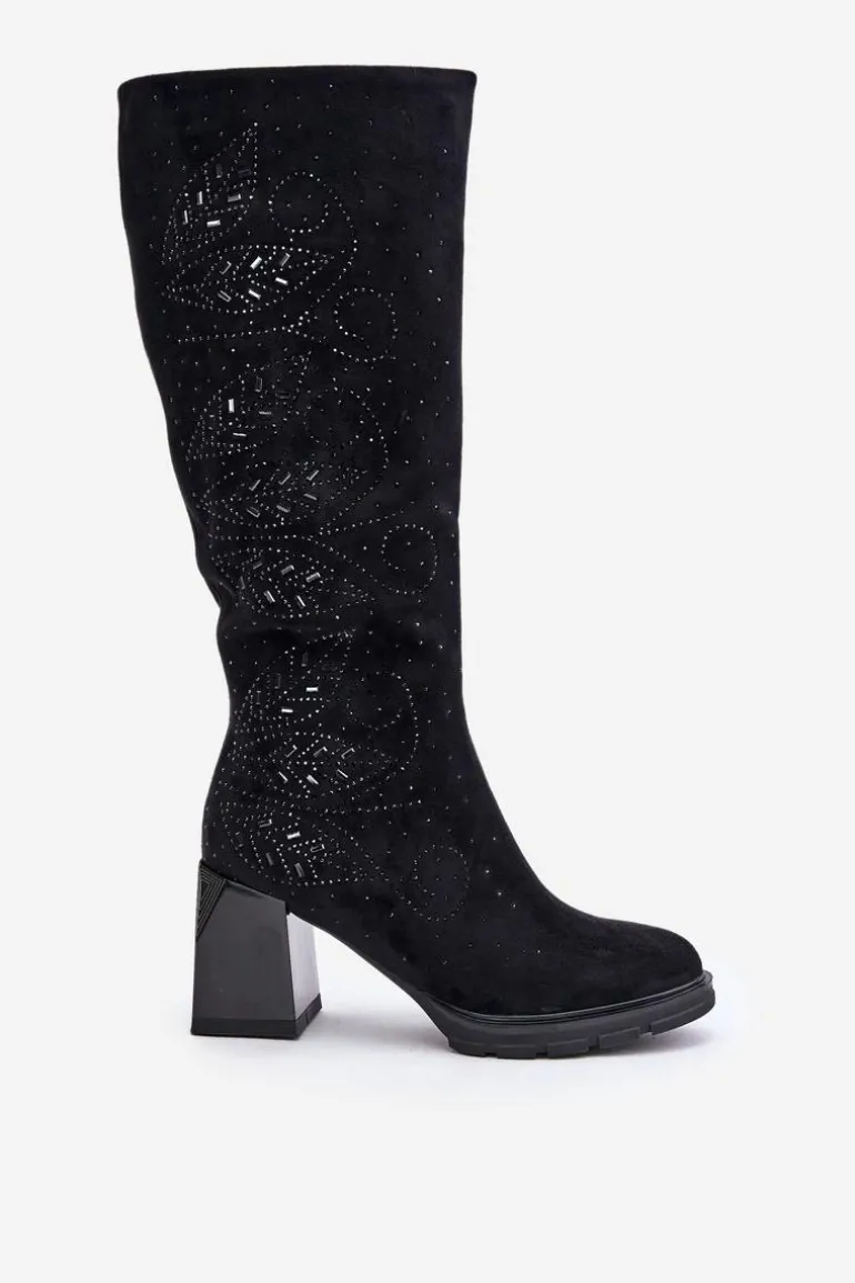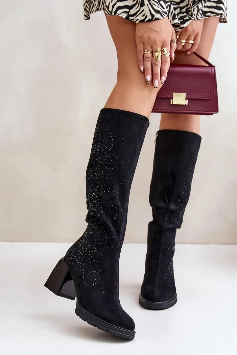Kozaki damskie wykonane z wysokiej jakości eko zamszu. Osadzone na obcasie w formie słupka. Głównym atutem tego modelu jest zdobienie na cholewce. Noski zaokrąglone. Środek ocieplony kocem obuwniczym. Cholewka sięga przed kolano. Przy wyborze rozmiaru prosimy sugerować się tabelą rozmiarów.
