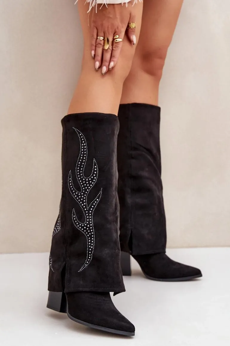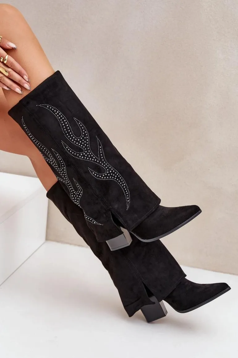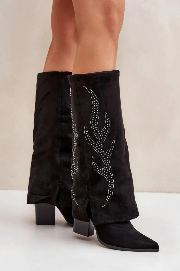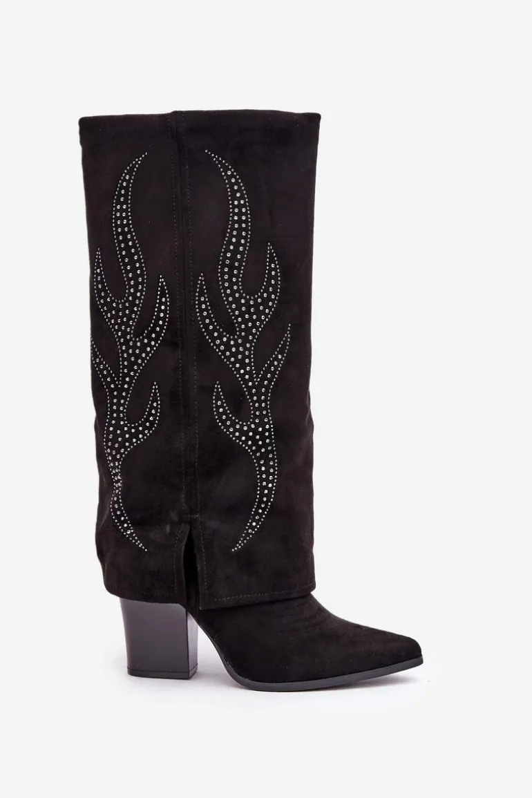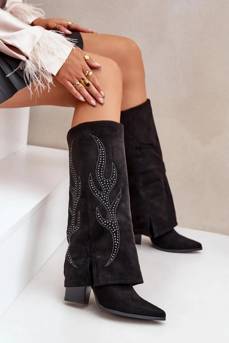 Kozaki damskie wykonane z eko zamszu. Model wsuwany z dodatkowym zapięciem na zamek na dole dla wygody zakładania i zdejmowania. Szpiczaste noski optycznie wysmuklają nogi, a wywinięta cholewka ze zdobieniem dodaje unikalnego charakteru. Stylowe i wyjątkowe, idealne do modnych stylizacji. Przy wyborze rozmiaru prosimy sugerować się tabelą rozmiarów.