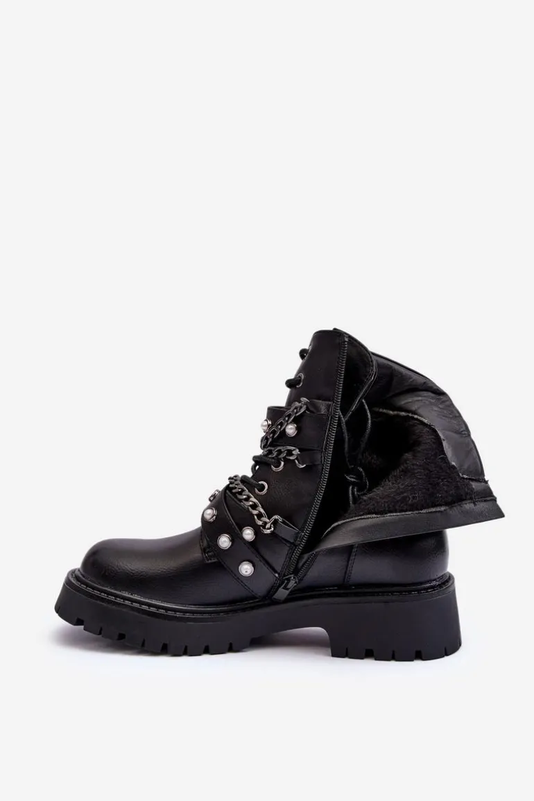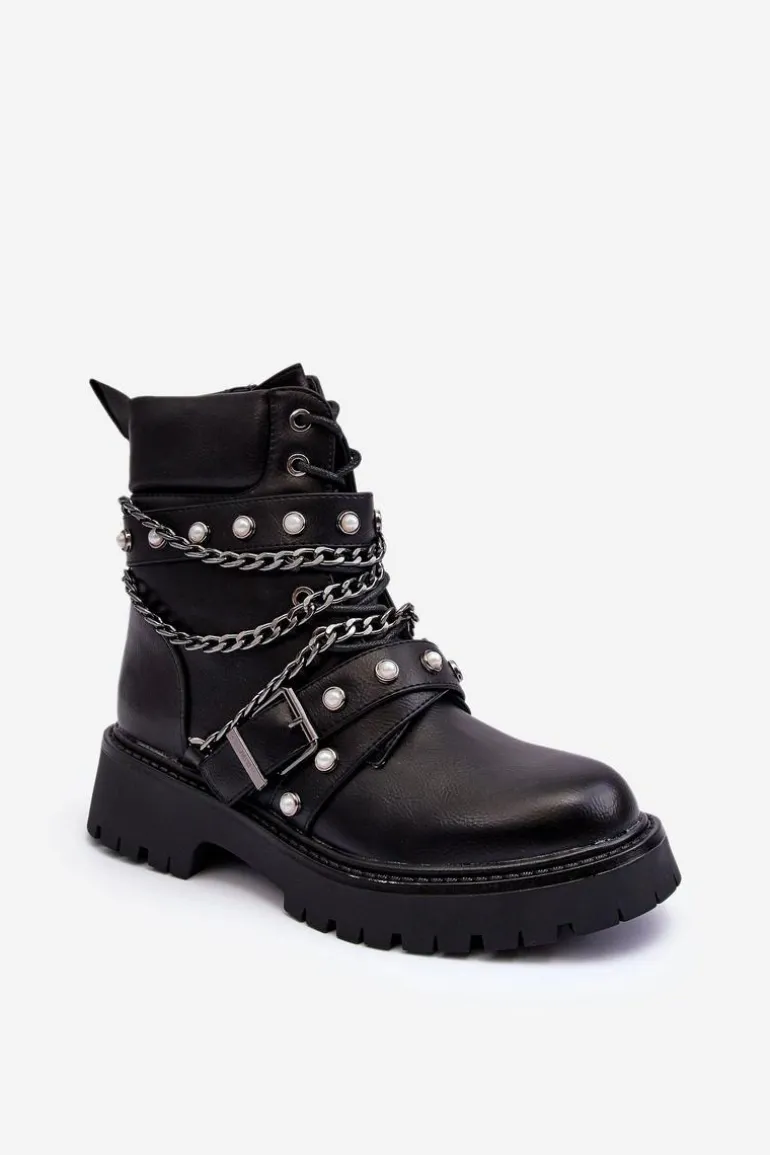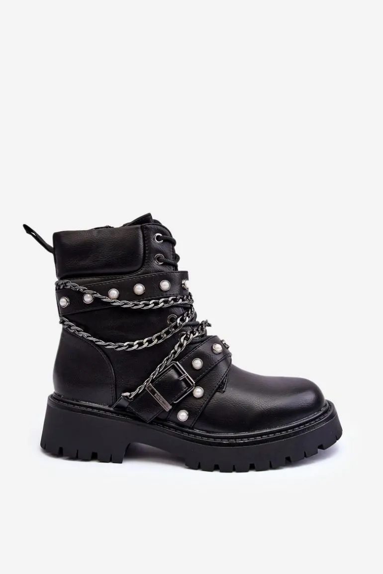 Zdobione Skórzane Damskie Botki Workery Czarne Sibenna