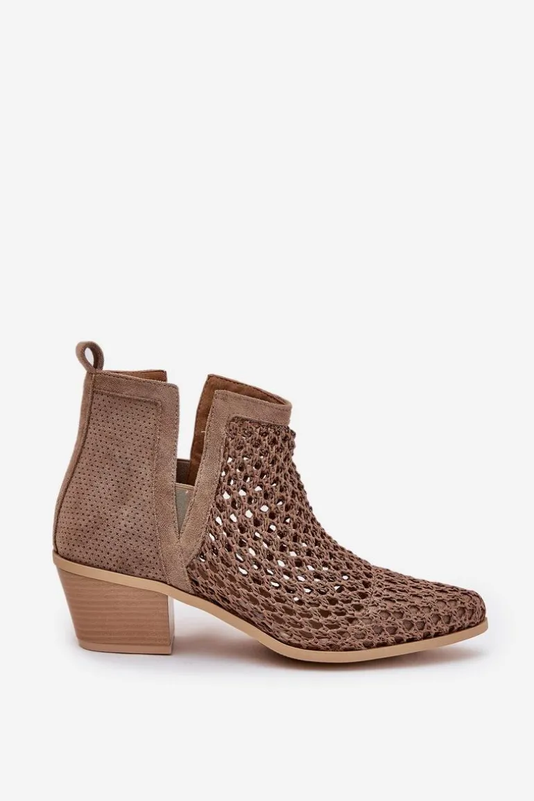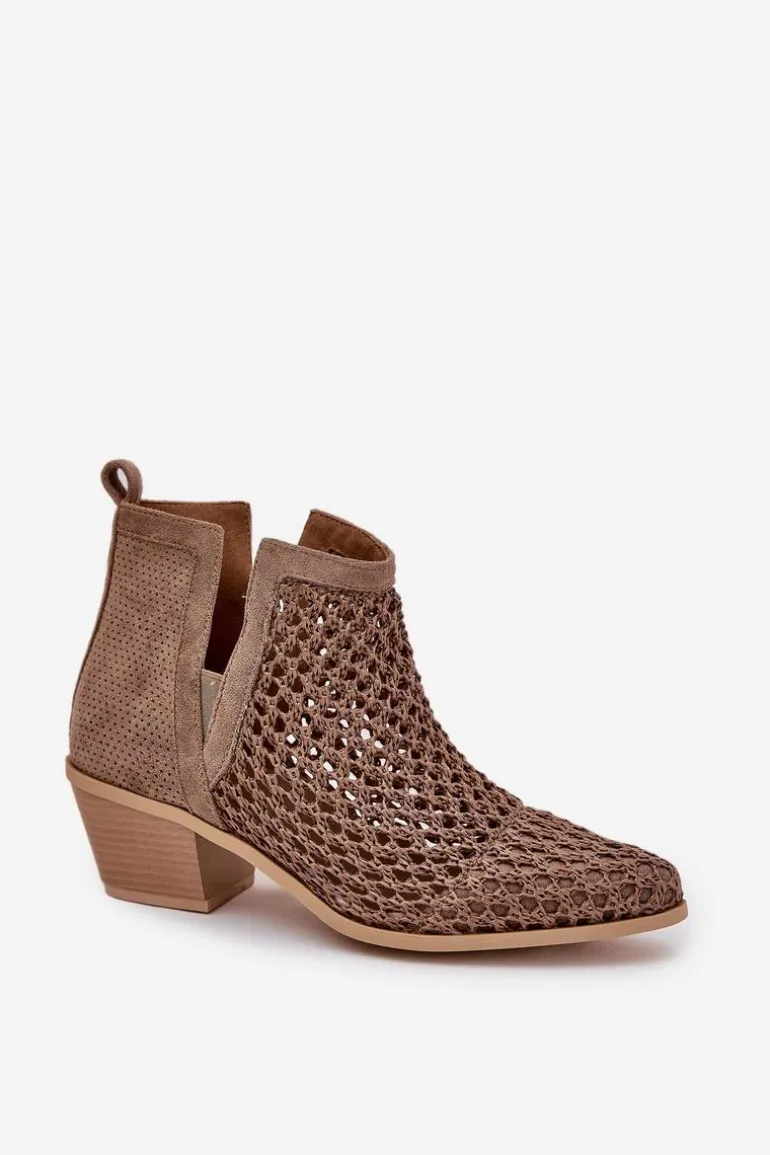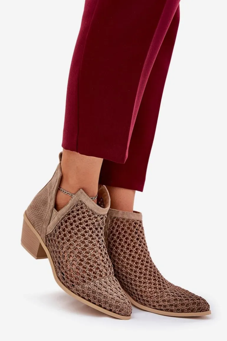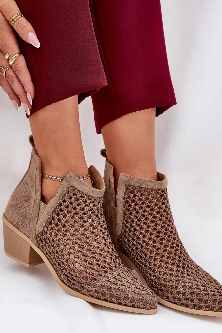 Niskie botki na obcasie, które łączą komfort z modnym wyglądem. Noski w szpic dodają im zmysłowego charakteru, a subtelne wycięcia po bokach cholewki sprawiają, że buty nabierają lekkości i nowoczesnego stylu. Przód buta ozdobiony ażurowym wzorem z plecionką, która podkreśla ich unikalny wygląd. Dodatkowym atutem jest miękka wkładka, zapewniająca wygodę podczas chodzenia przez cały dzień. Idealny wybór na wiosenne i letnie dni. Przy wyborze rozmiaru prosimy sugerować się tabelą rozmiarów.