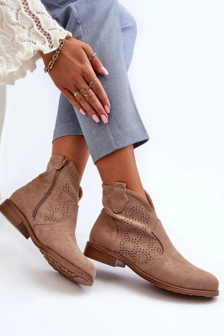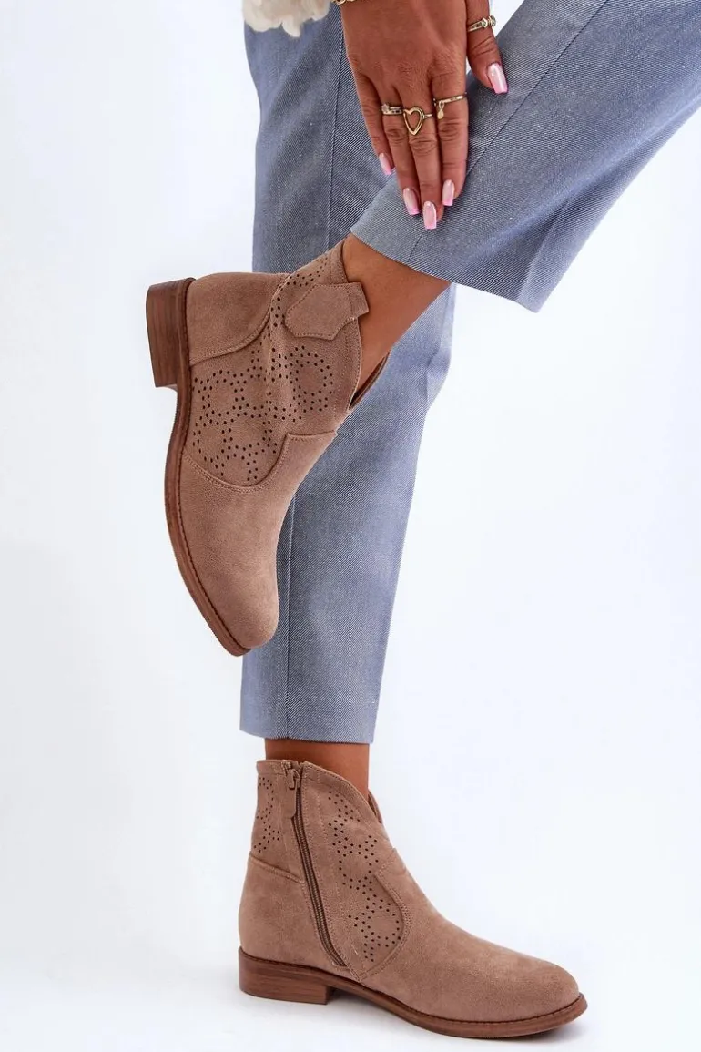Botki damskie wykonane z eko zamszu to idealny wybór na wiosenne dni. Ażurowa cholewka nadaje im delikatności. Płaski obcas zapewnia stabilność i komfort użytkowania. Zapinanie na zamek ułatwia szybkie zakładanie i zdejmowanie obuwia. Te modne botki będą doskonałym uzupełnieniem Twojej wiosennej garderoby! Koniecznie powinnaś je mieć! Przy wyborze rozmiaru prosimy sugerować się tabelą rozmiarów.