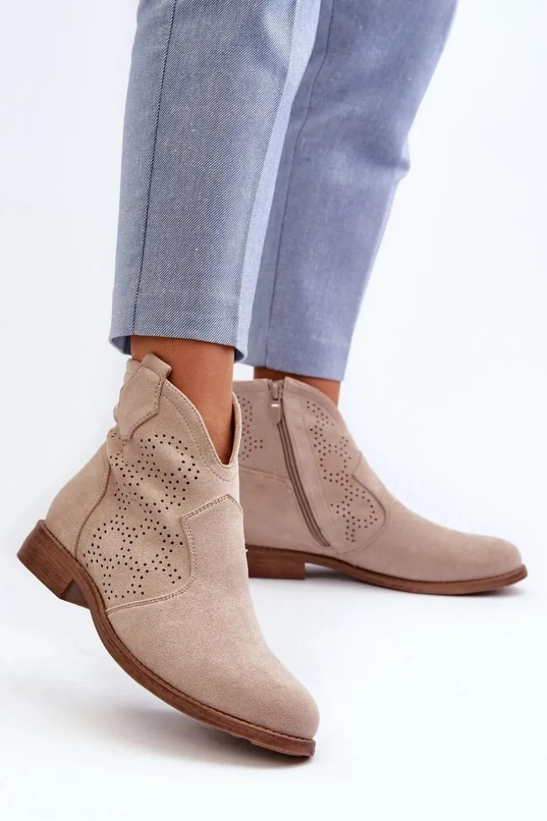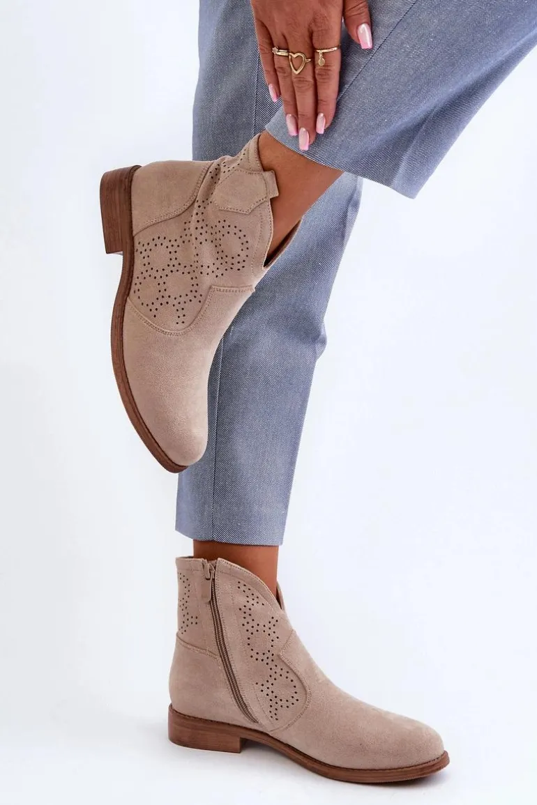 Botki damskie wykonane z eko zamszu to idealny wybór na wiosenne dni. Ażurowa cholewka nadaje im delikatności. Płaski obcas zapewnia stabilność i komfort użytkowania. Zapinanie na zamek ułatwia szybkie zakładanie i zdejmowanie obuwia. Te modne botki będą doskonałym uzupełnieniem Twojej wiosennej garderoby! Koniecznie powinnaś je mieć! Przy wyborze rozmiaru prosimy sugerować się tabelą rozmiarów.