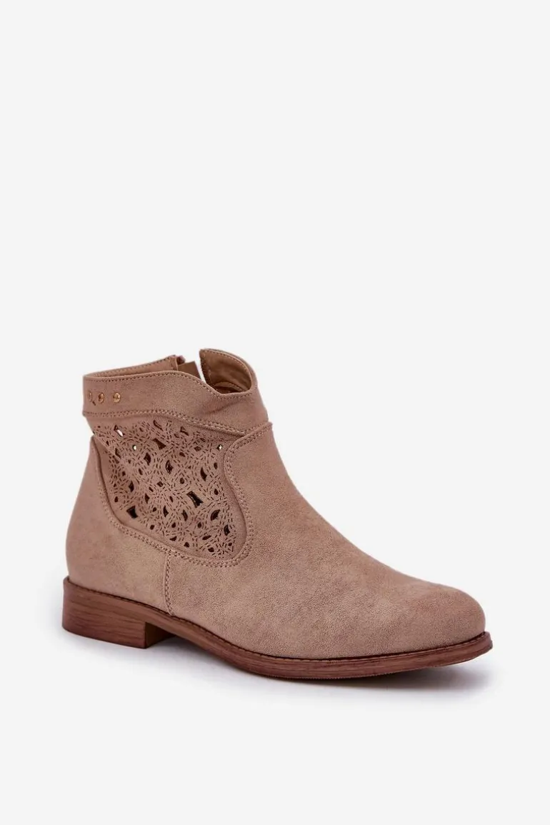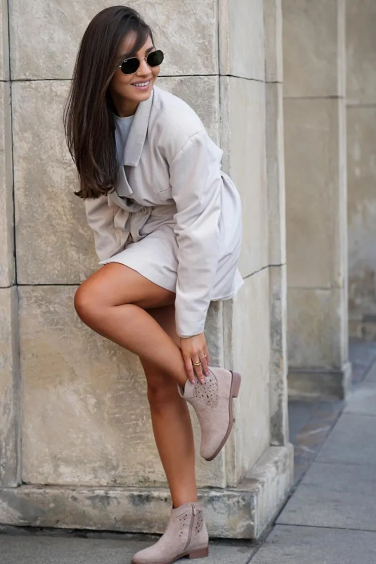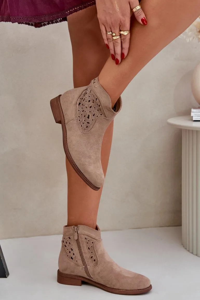 Botki damskie od marki S.Barski, wykonane z eko zamszu, to elegancka i wygodna propozycja na chłodniejsze dni. Osadzone na płaskim obcasie, zapewniają stabilność i komfort przez cały dzień. Zapinane na zamek, co ułatwia ich zakładanie. Zaokrąglone noski dodają im subtelnego charakteru, a ażurowa cholewka nadaje lekkości i nowoczesnego stylu. Te botki to doskonały wybór do codziennych stylizacji! Przy wyborze rozmiaru prosimy sugerować się tabelą rozmiarów.