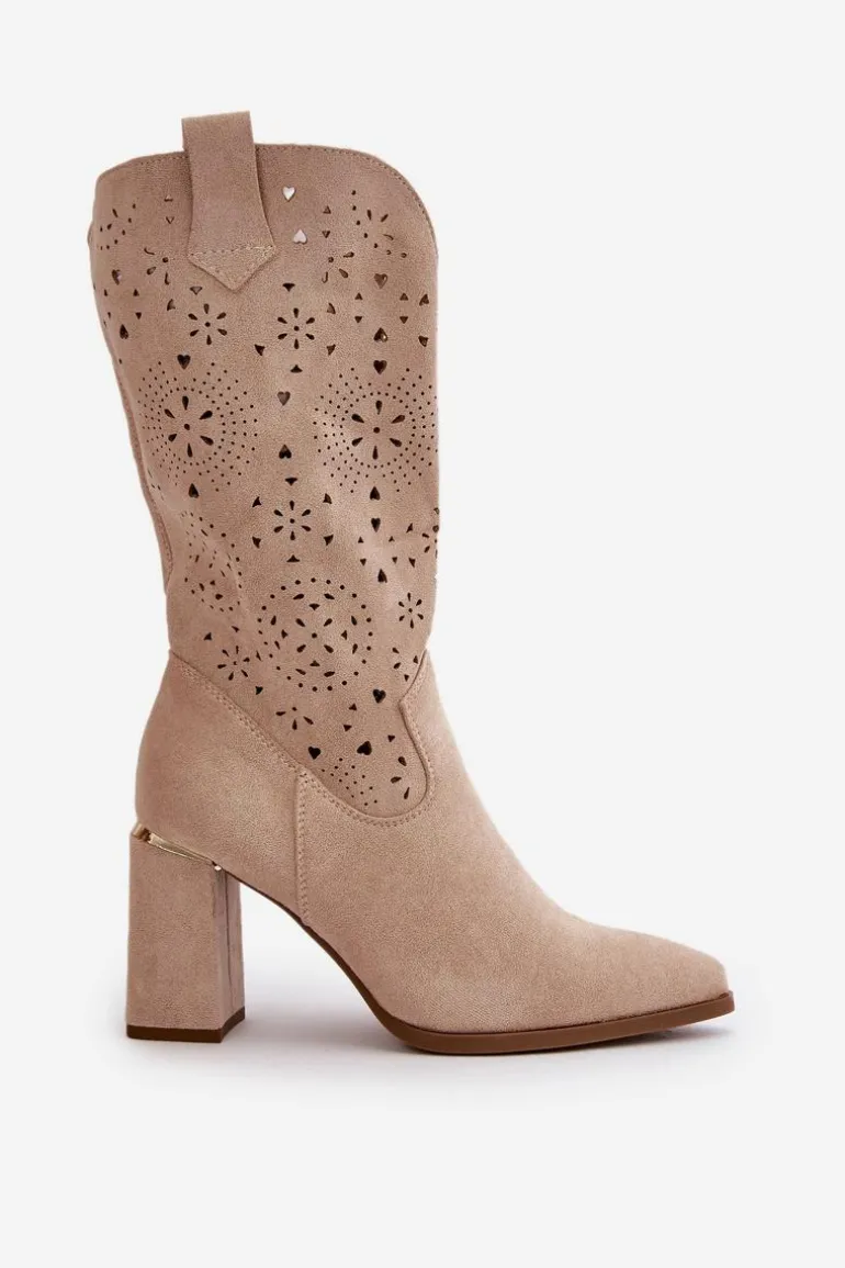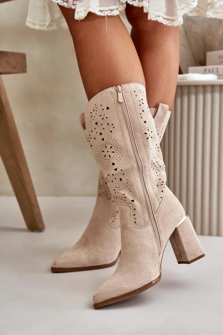 Damskie botki z przyjemnego w dotyku eko zamszu. Posiadają ażurową cholewkę sięgającą do połowy łydki. Osadzone na słupkowym obcasie z lustrzanym akcentem. Zapinane na zamek, z noskami w szpic. Ten modny i elegancki fason będzie idealnym dopełnieniem wielu stylizacji! Przy wyborze rozmiaru prosimy sugerować się tabelą rozmiarów.