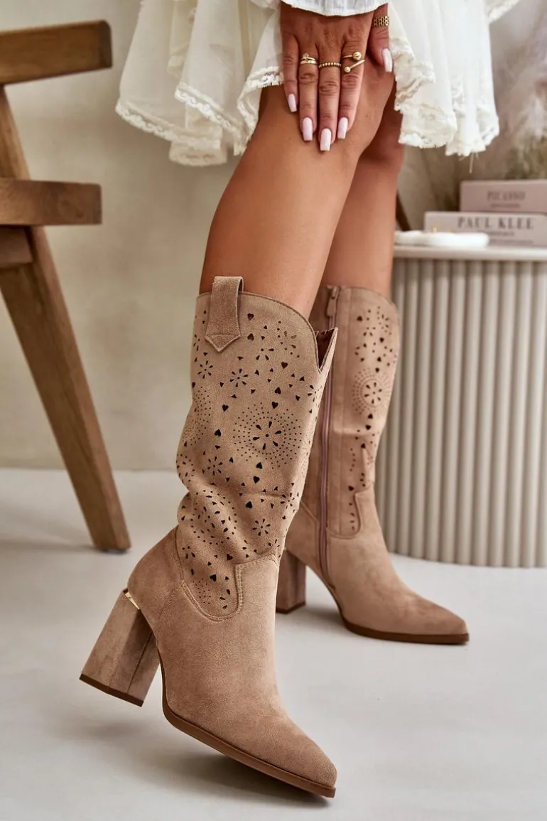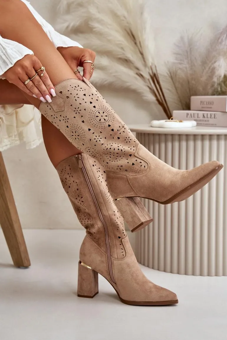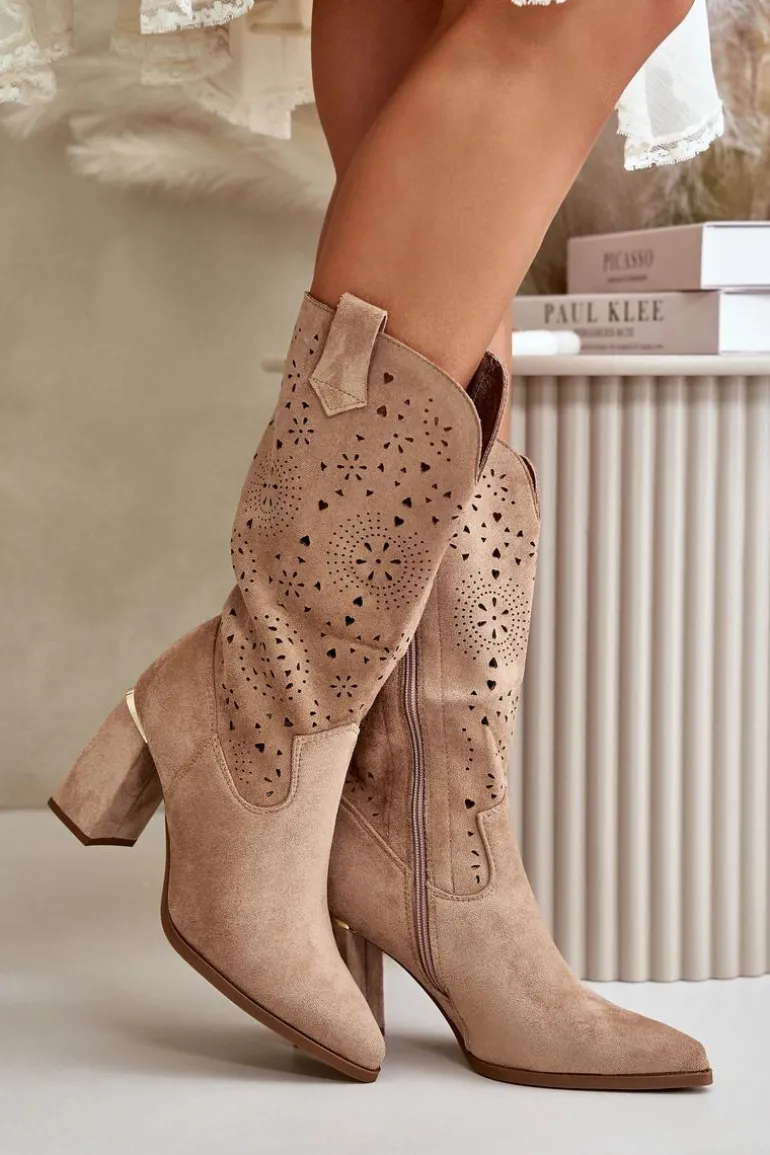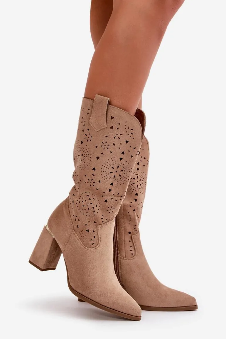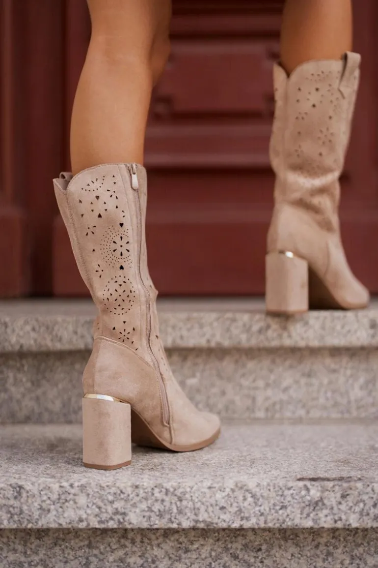 Damskie botki z przyjemnego w dotyku eko zamszu. Posiadają ażurową cholewkę sięgającą do połowy łydki. Osadzone na słupkowym obcasie z lustrzanym akcentem. Zapinane na zamek, z noskami w szpic. Ten modny i elegancki fason będzie idealnym dopełnieniem wielu stylizacji! Przy wyborze rozmiaru prosimy sugerować się tabelą rozmiarów.