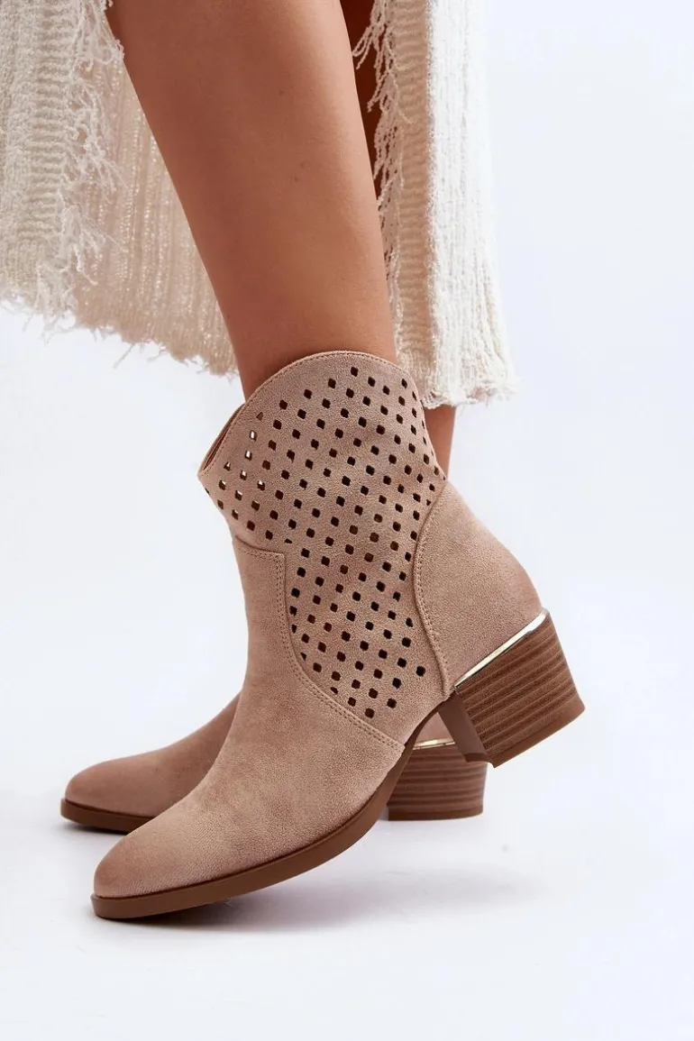 Z tymi botkami idealnie przygotujesz się na nadchodzący sezon! Eko zamszowa cholewka w ażurowy wzorek charakteryzuje ten model. Niski obcas zapewni stabilność na każdym kroku. Model ten zapinany jest na zamek. Noski w migdał. Fason ten idealnie dopełni wiosenne stylizacje! Przy wyborze rozmiaru prosimy sugerować się tabelą rozmiarów.