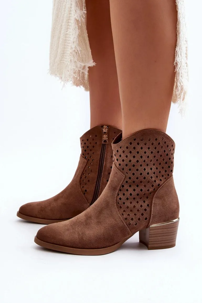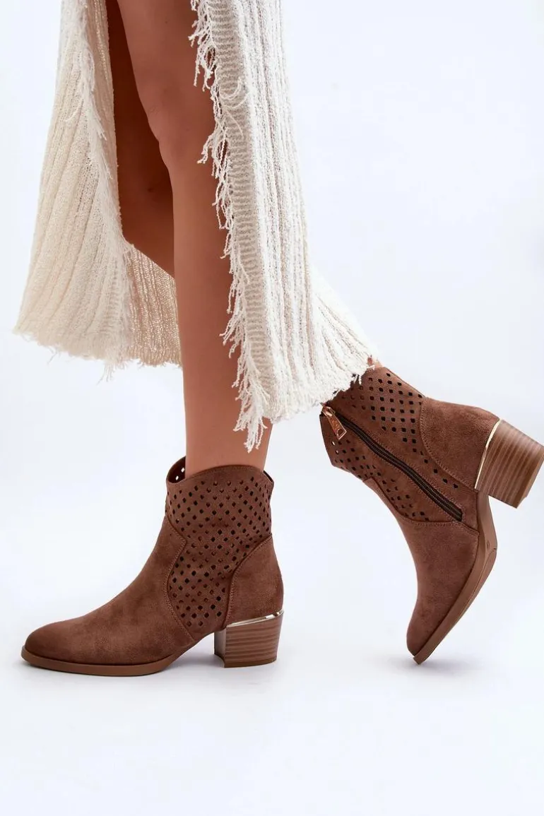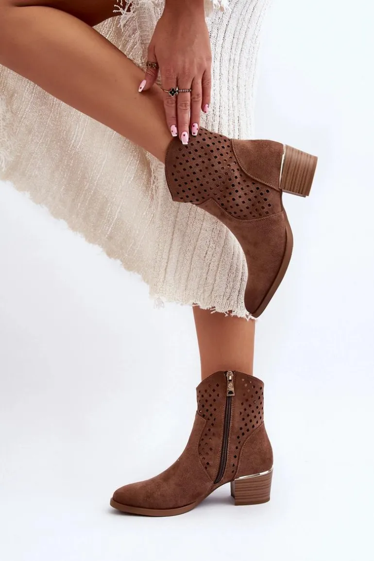 Z tymi botkami idealnie przygotujesz się na nadchodzący sezon! Eko zamszowa cholewka w ażurowy wzorek charakteryzuje ten model. Niski obcas zapewni stabilność na każdym kroku. Model ten zapinany jest na zamek. Noski w migdał. Fason ten idealnie dopełni wiosenne stylizacje! Przy wyborze rozmiaru prosimy sugerować się tabelą rozmiarów.