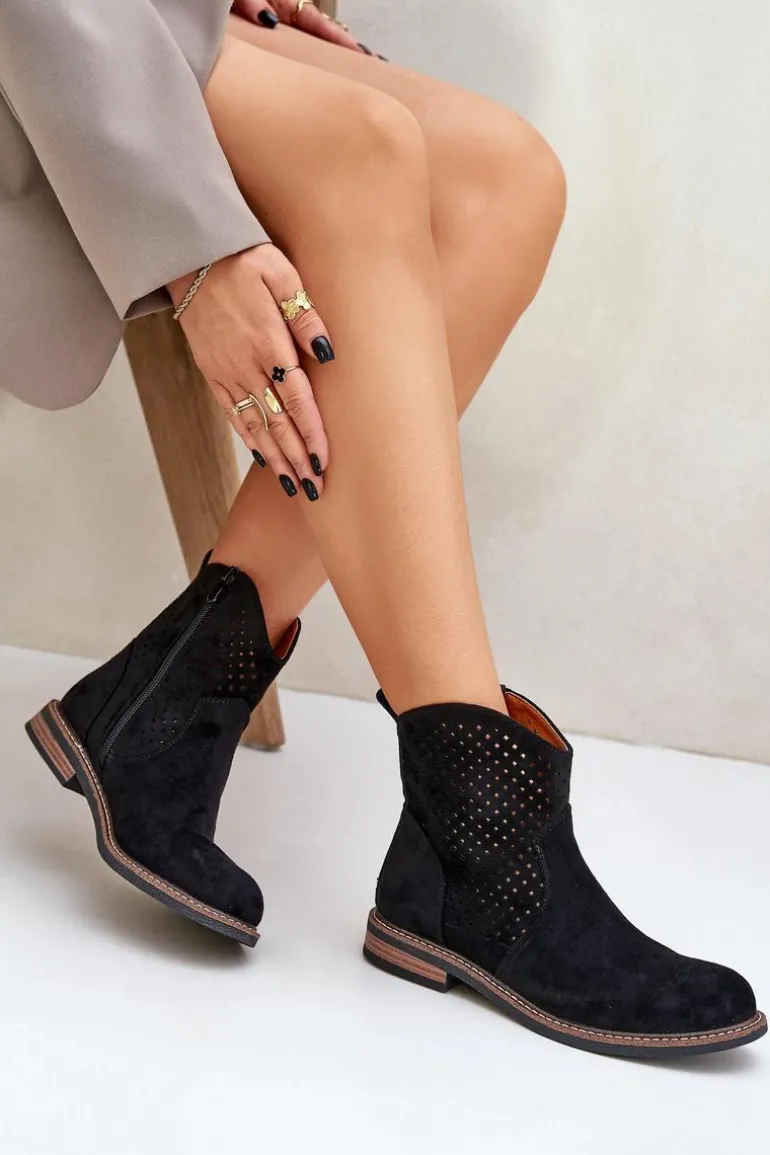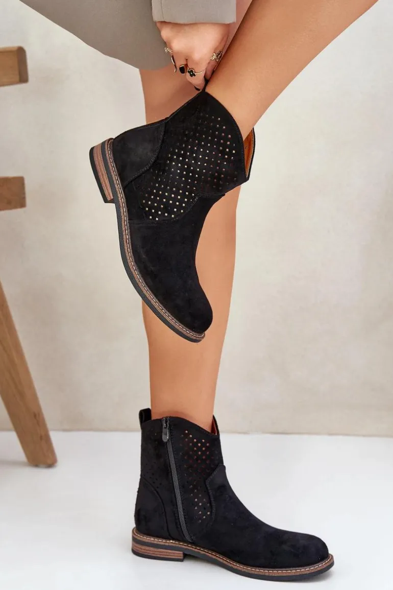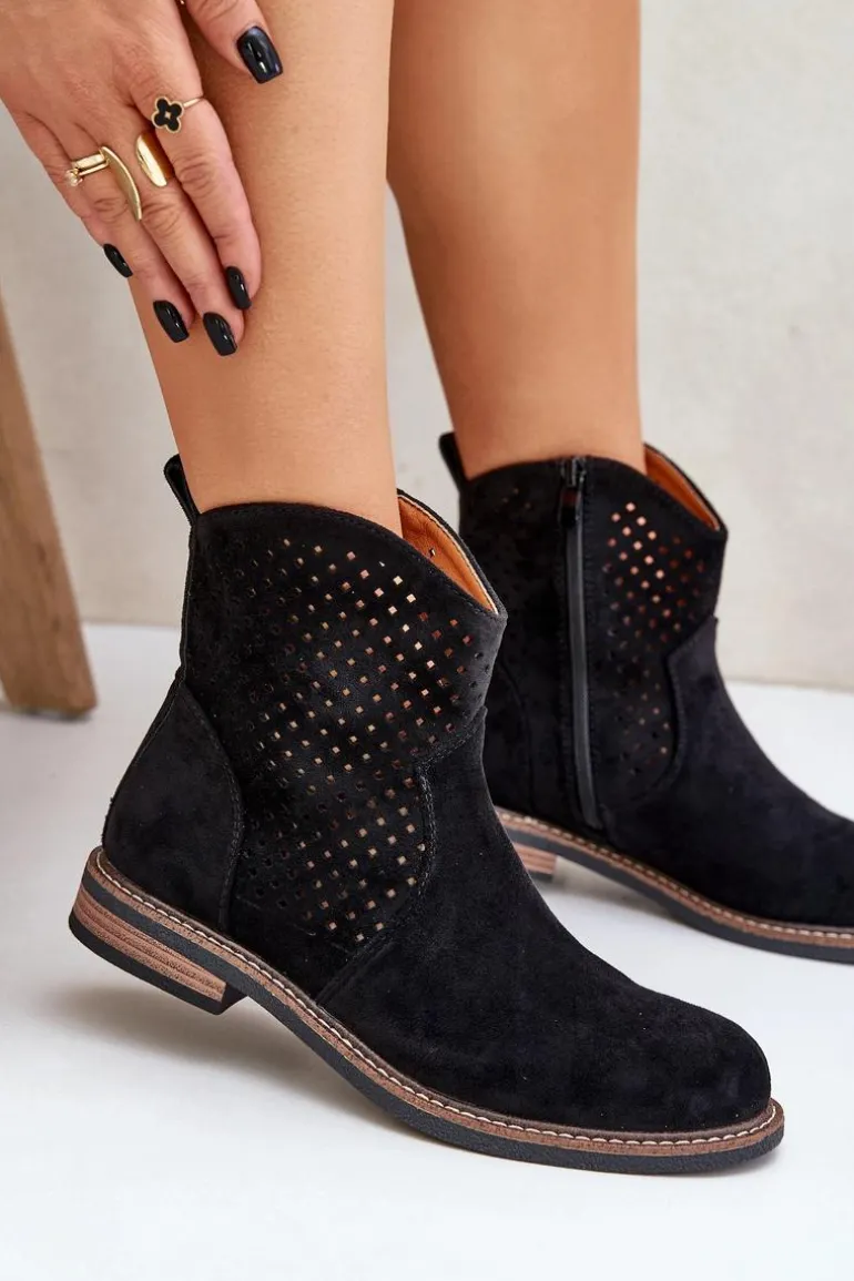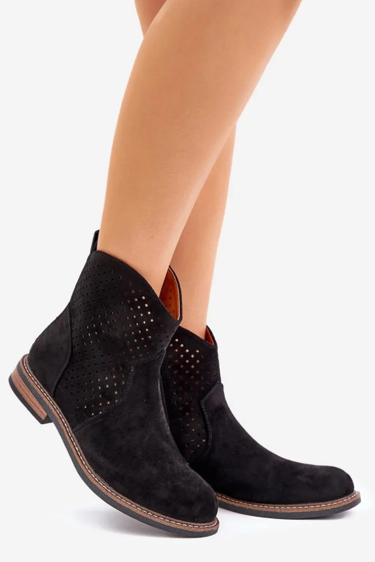 Botki damskie wykonane z eko zamszu to idealny wybór na wiosenne dni. Ażurowa cholewka nadaje im lekkości i zapewnia przewiewność, a zaokrąglone noski dodają subtelności. Model osadzony na płaskim obcasie gwarantuje wygodę noszenia przez cały dzień. Dzięki praktycznemu zapięciu na zamek zakładanie i zdejmowanie butów jest niezwykle łatwe. Skórzana wkładka dba o komfort stóp, czyniąc te botki doskonałym rozwiązaniem zarówno do codziennych, jak i bardziej eleganckich stylizacji. Połączenie stylu i funkcjonalności w jednym! Przy wyborze rozmiaru prosimy sugerować się tabelą rozmiarów.