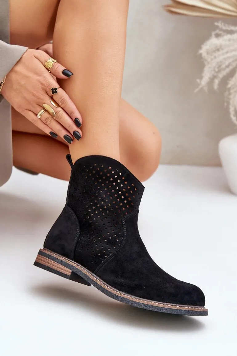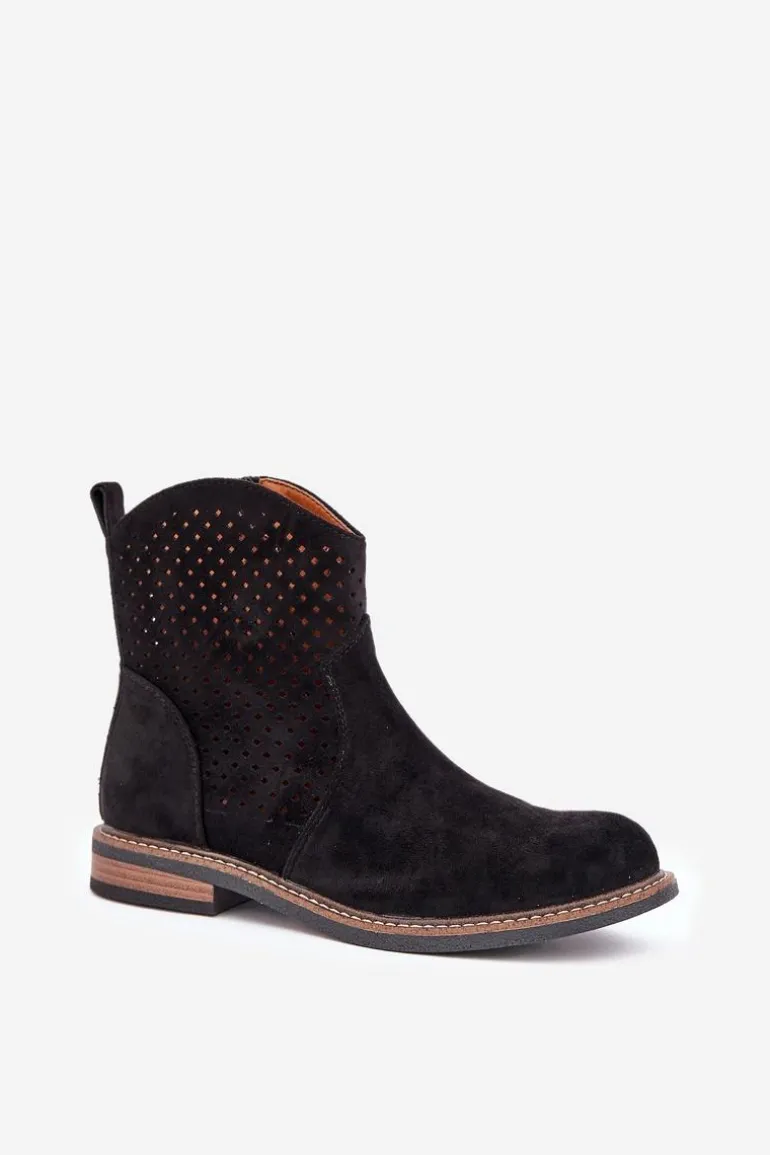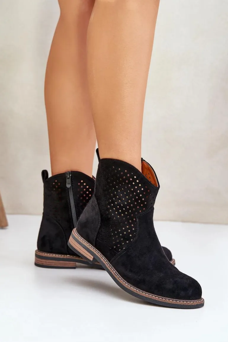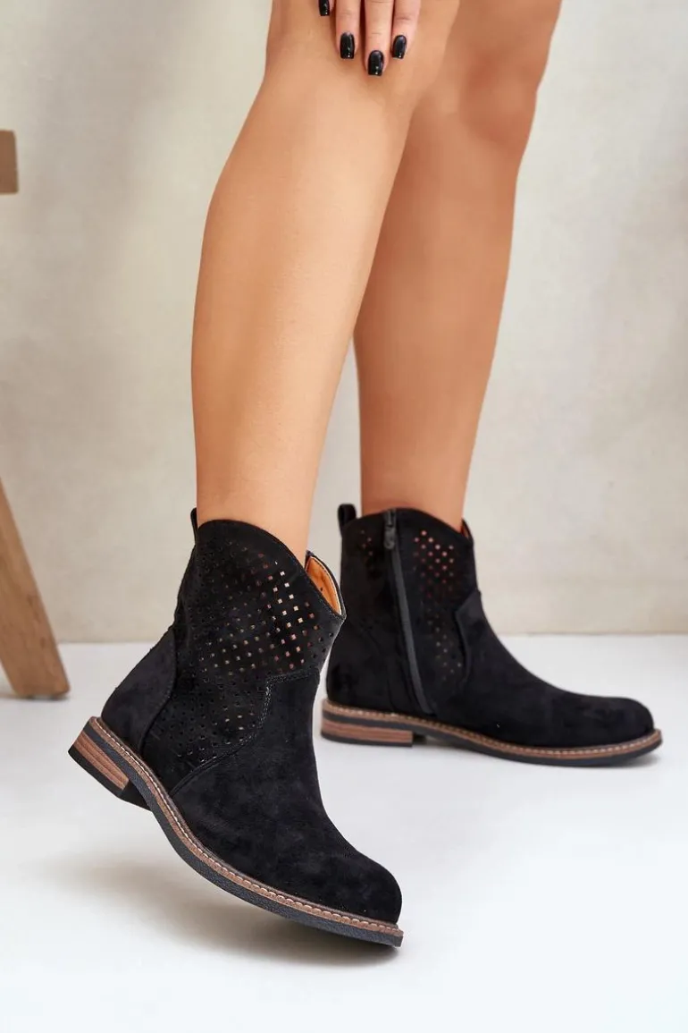 Botki damskie wykonane z eko zamszu to idealny wybór na wiosenne dni. Ażurowa cholewka nadaje im lekkości i zapewnia przewiewność, a zaokrąglone noski dodają subtelności. Model osadzony na płaskim obcasie gwarantuje wygodę noszenia przez cały dzień. Dzięki praktycznemu zapięciu na zamek zakładanie i zdejmowanie butów jest niezwykle łatwe. Skórzana wkładka dba o komfort stóp, czyniąc te botki doskonałym rozwiązaniem zarówno do codziennych, jak i bardziej eleganckich stylizacji. Połączenie stylu i funkcjonalności w jednym! Przy wyborze rozmiaru prosimy sugerować się tabelą rozmiarów.