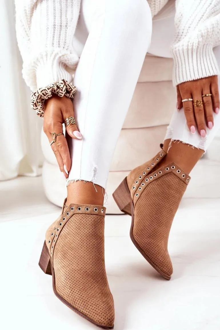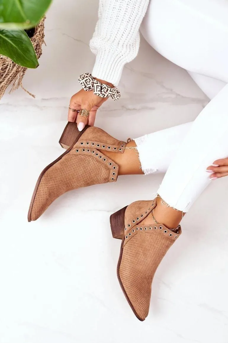 Piękne botki damskie z wycięciami wykonane z eko zamszu. Miękka wkładka oraz wygodny obcas zadbają o Twój komfort. Przy wyborze rozmiaru prosimy sugerować się tabelą rozmiarów.