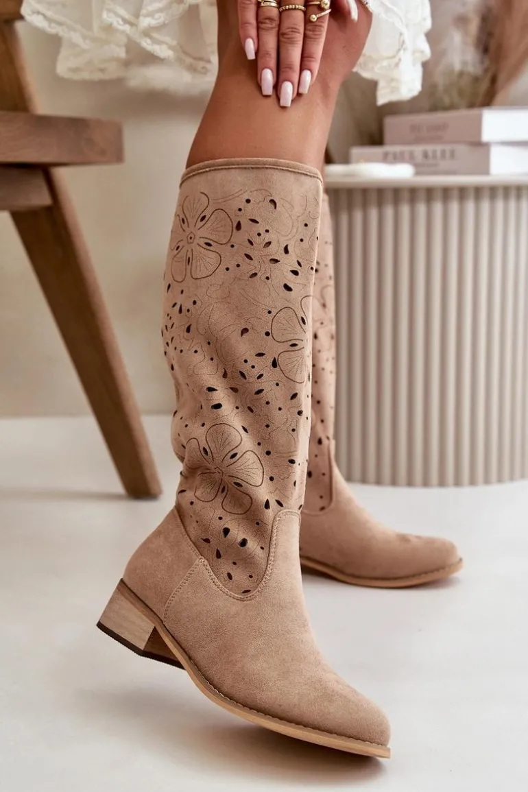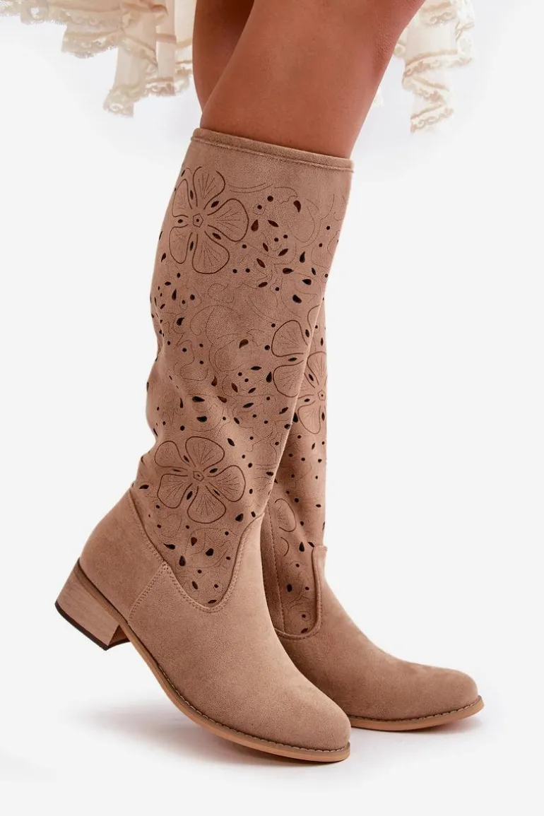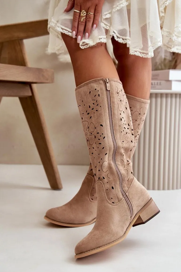 Kozaki damskie wykonane z wysokiej jakości eko zamszu. Cholewka sięga przed kolano, a jej ażurowy wzór dodaje wyjątkowego charakteru. Zapinane na zamek, co ułatwia zakładanie i zdejmowanie. Osadzone na niskim obcasie, który gwarantuje komfort noszenia przez cały dzień. Noski są zaokrąglone. Usztywniony zapiętek zapewnia dodatkowe wsparcie i stabilność. Te kozaki doskonale sprawdzą się zarówno w casualowych, jak i bardziej eleganckich stylizacjach. Przy wyborze rozmiaru prosimy kierować tabelą rozmiarów.