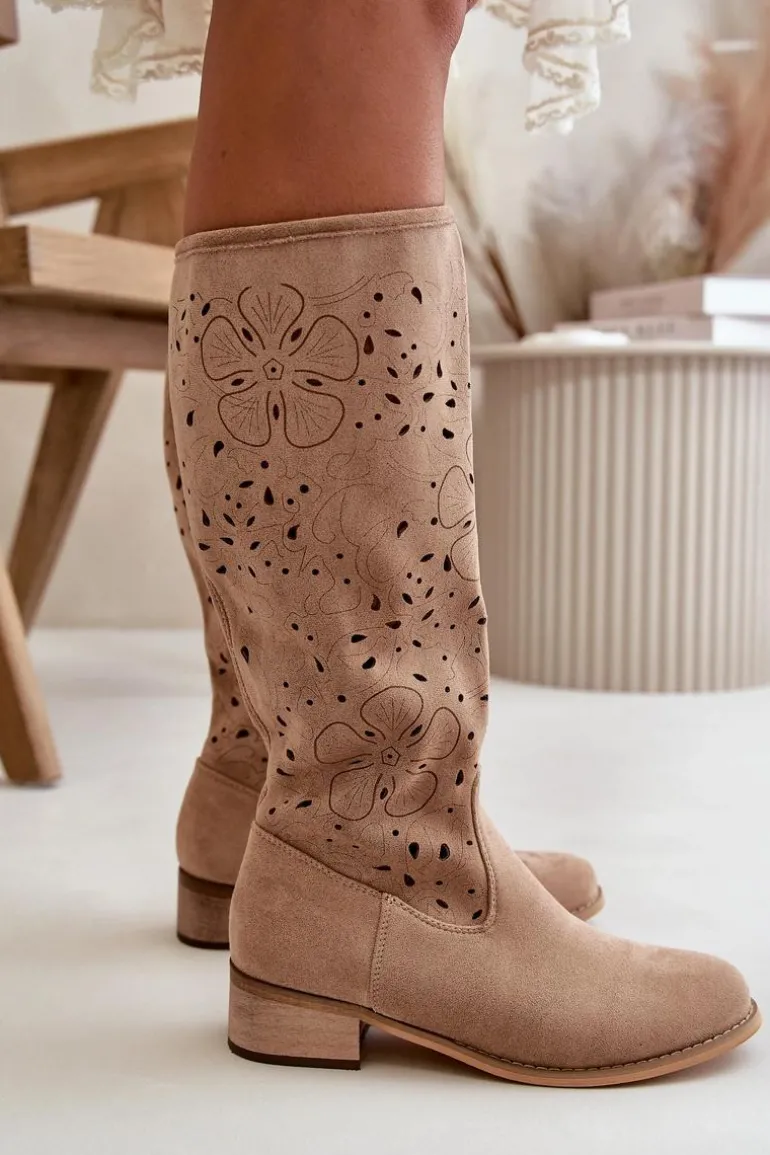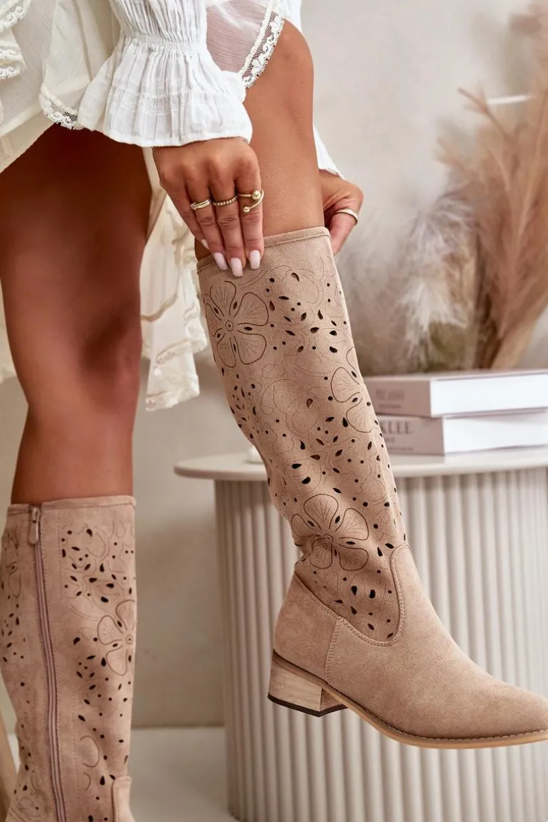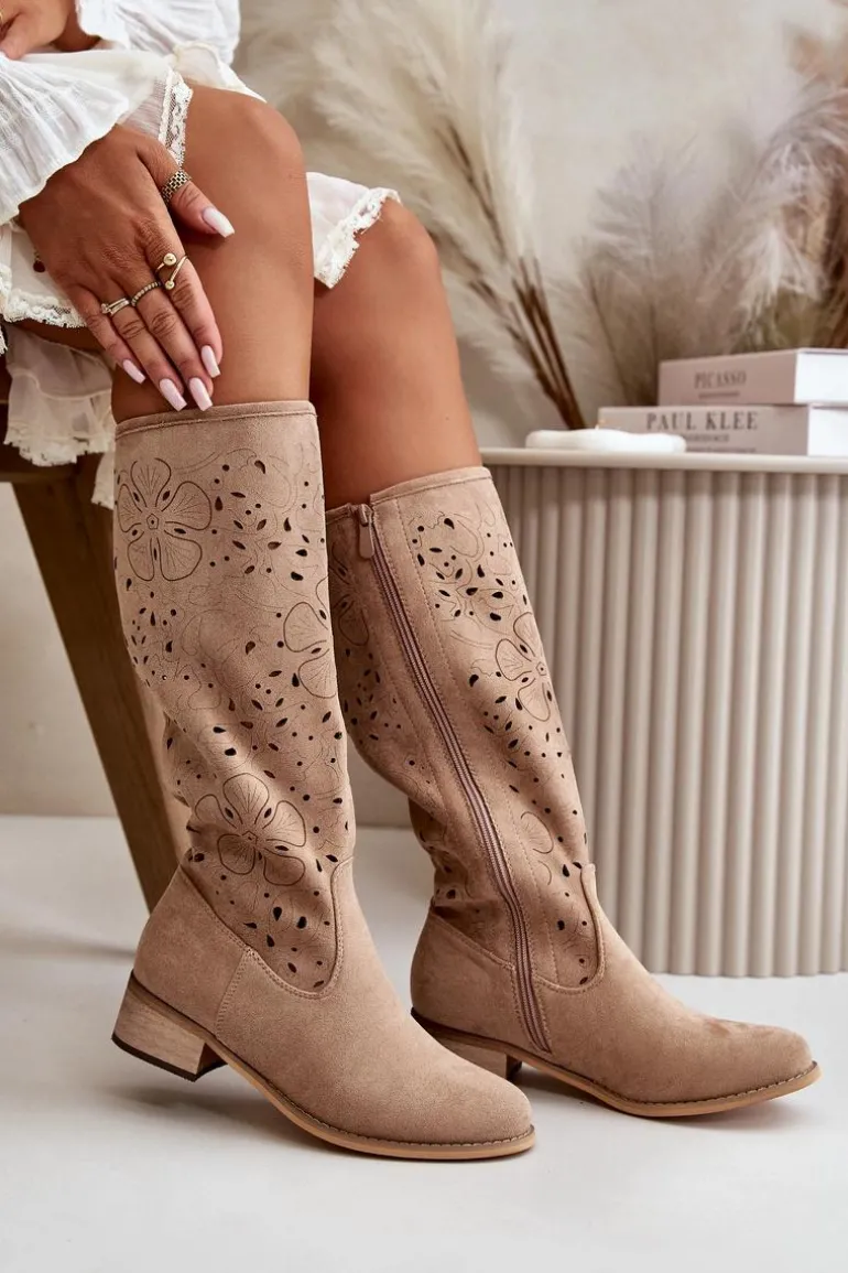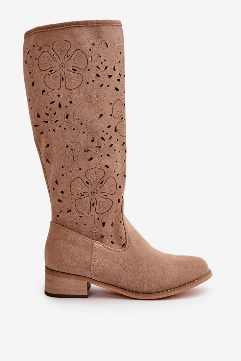Kozaki damskie wykonane z wysokiej jakości eko zamszu. Cholewka sięga przed kolano, a jej ażurowy wzór dodaje wyjątkowego charakteru. Zapinane na zamek, co ułatwia zakładanie i zdejmowanie. Osadzone na niskim obcasie, który gwarantuje komfort noszenia przez cały dzień. Noski są zaokrąglone. Usztywniony zapiętek zapewnia dodatkowe wsparcie i stabilność. Te kozaki doskonale sprawdzą się zarówno w casualowych, jak i bardziej eleganckich stylizacjach. Przy wyborze rozmiaru prosimy kierować tabelą rozmiarów.