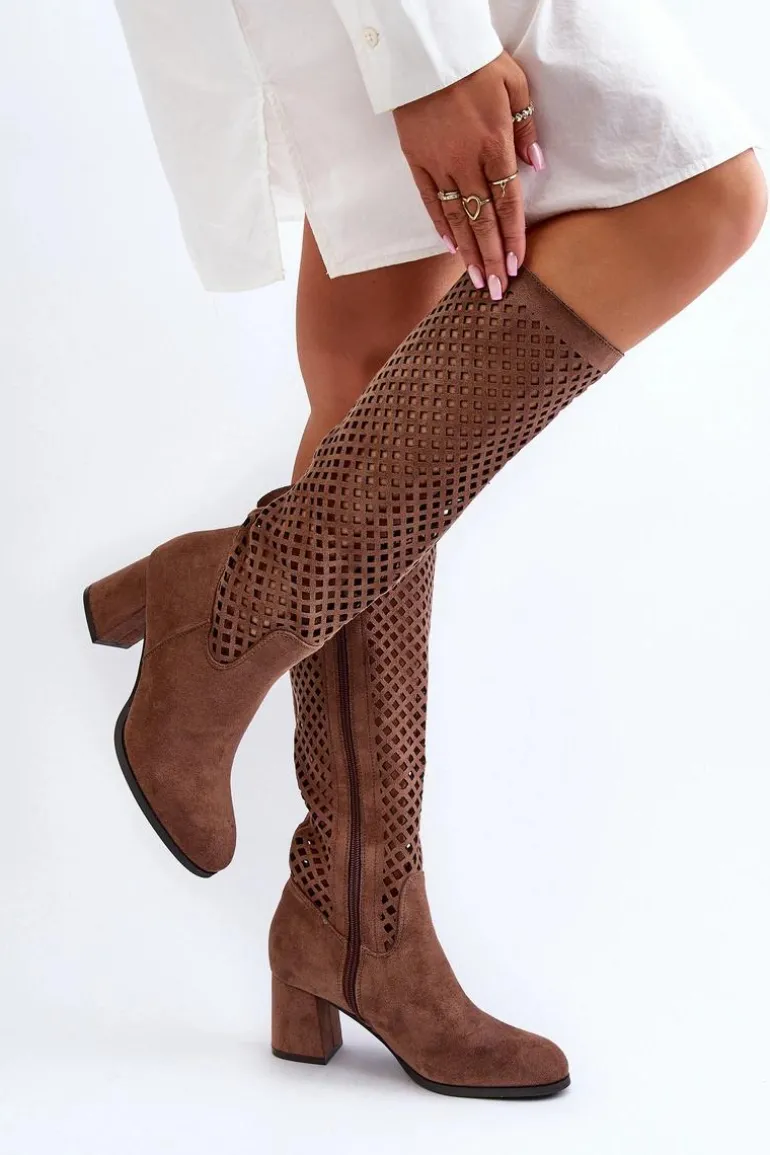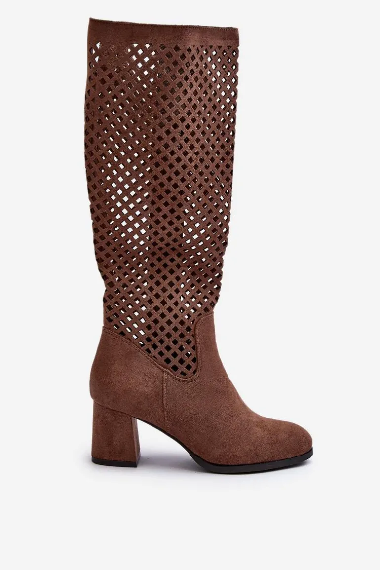 Damskie kozaki marki Jezzi. Wykonane z wysokiej jakości eko zamszu, prezentują się niezwykle elegancko. Ich ażurowy wzór dodaje im subtelnego uroku. Obcas niski słupek gwarantuje zarówno stabilność, jak i wygodę, pozwalając Ci cieszyć się pewnością kroku przez cały dzień. Usztywniony zapiętek dodaje dodatkowego wsparcia i komfortu dla Twojej stopy, co jest istotne, szczególnie podczas dłuższych spacerów. Przy wyborze rozmiaru prosimy sugerować się tabelą rozmiarów.