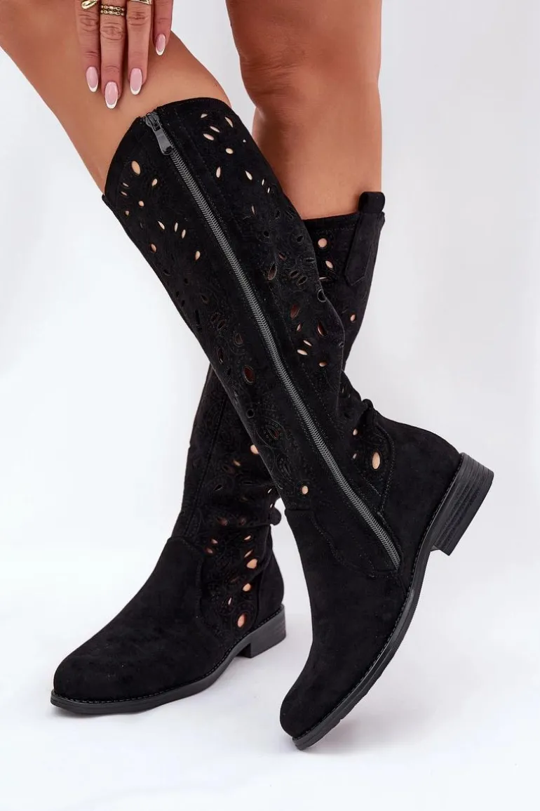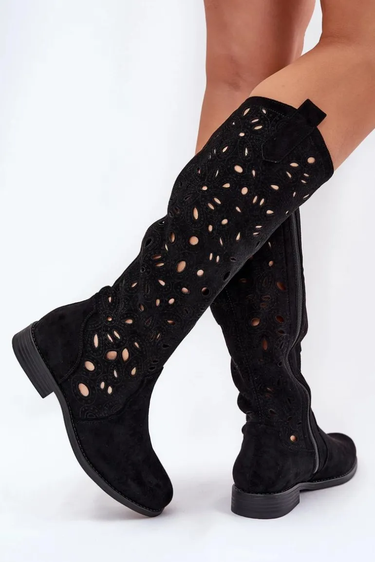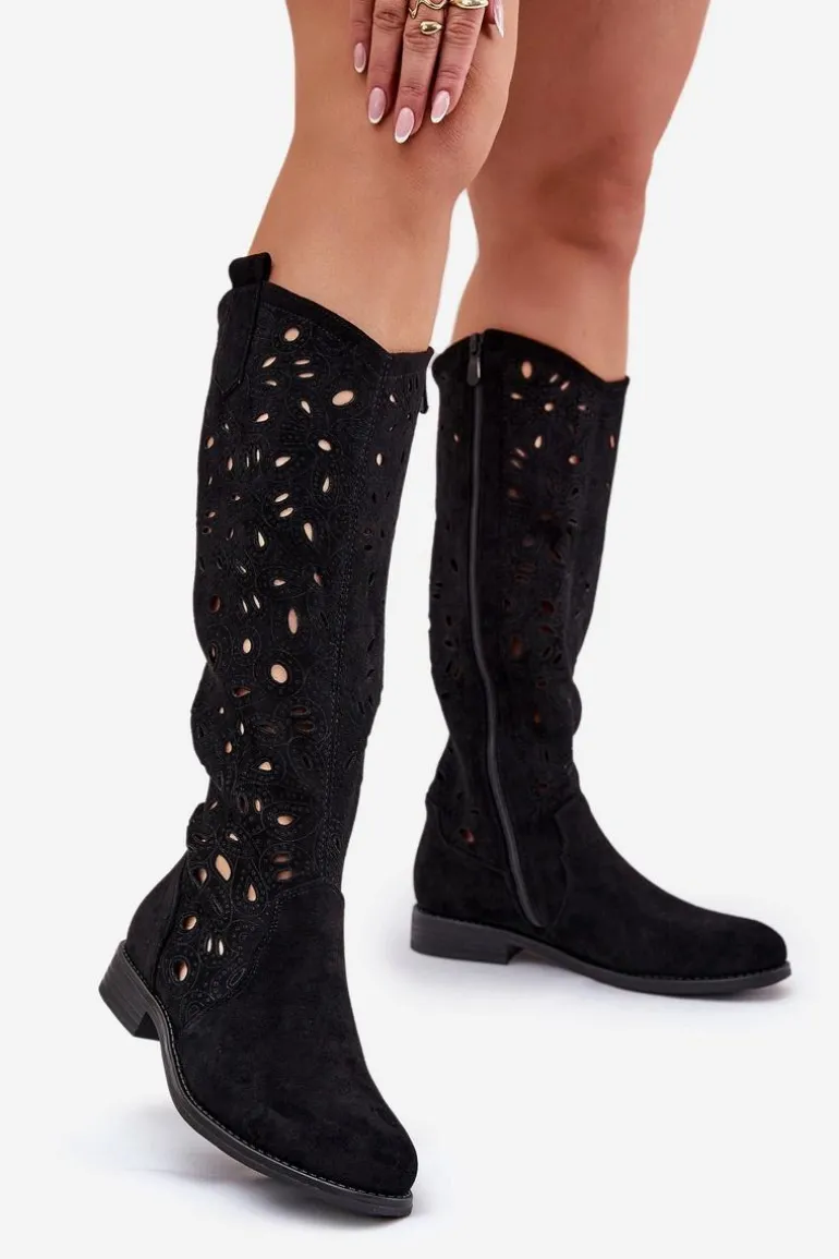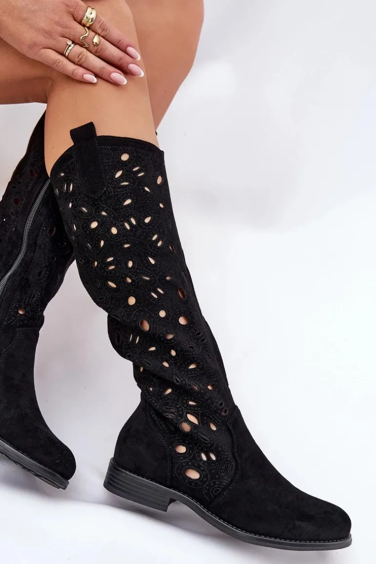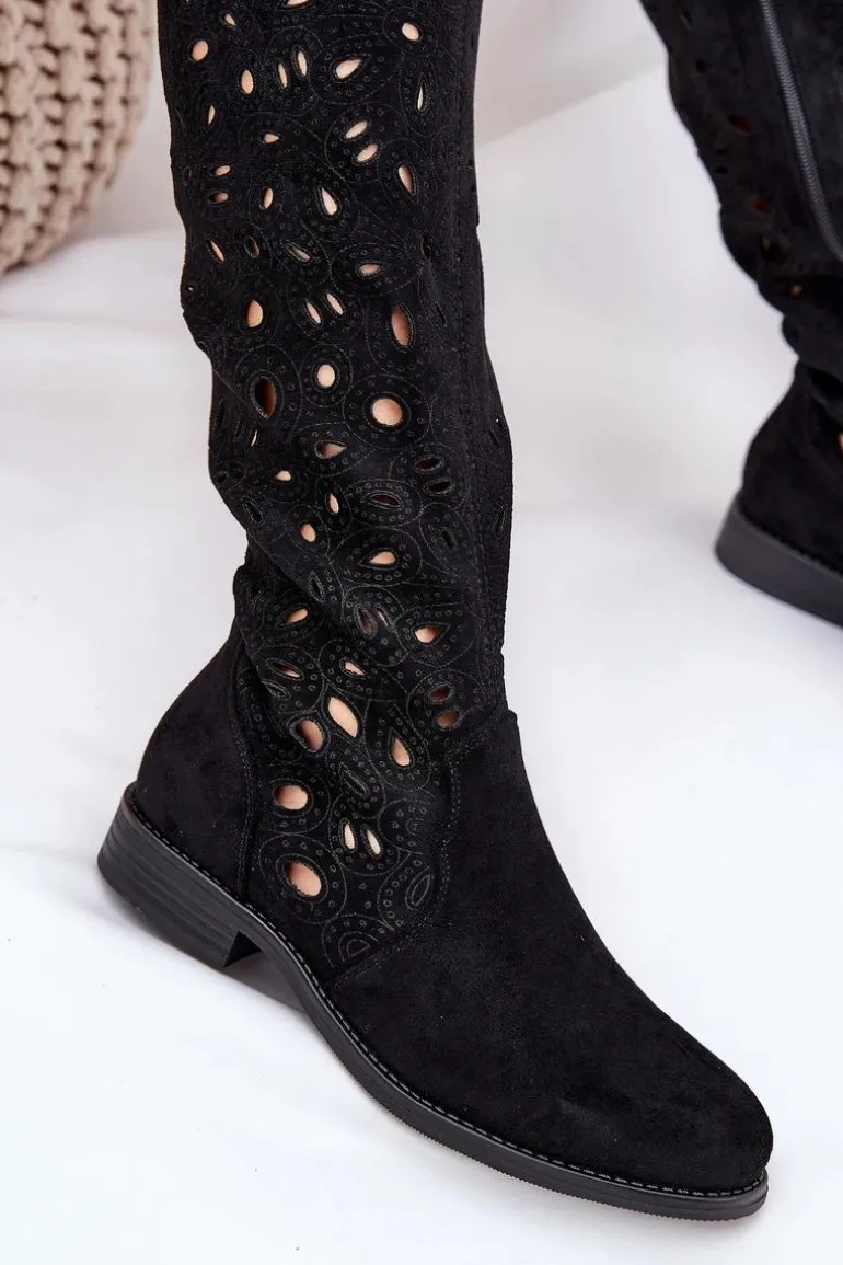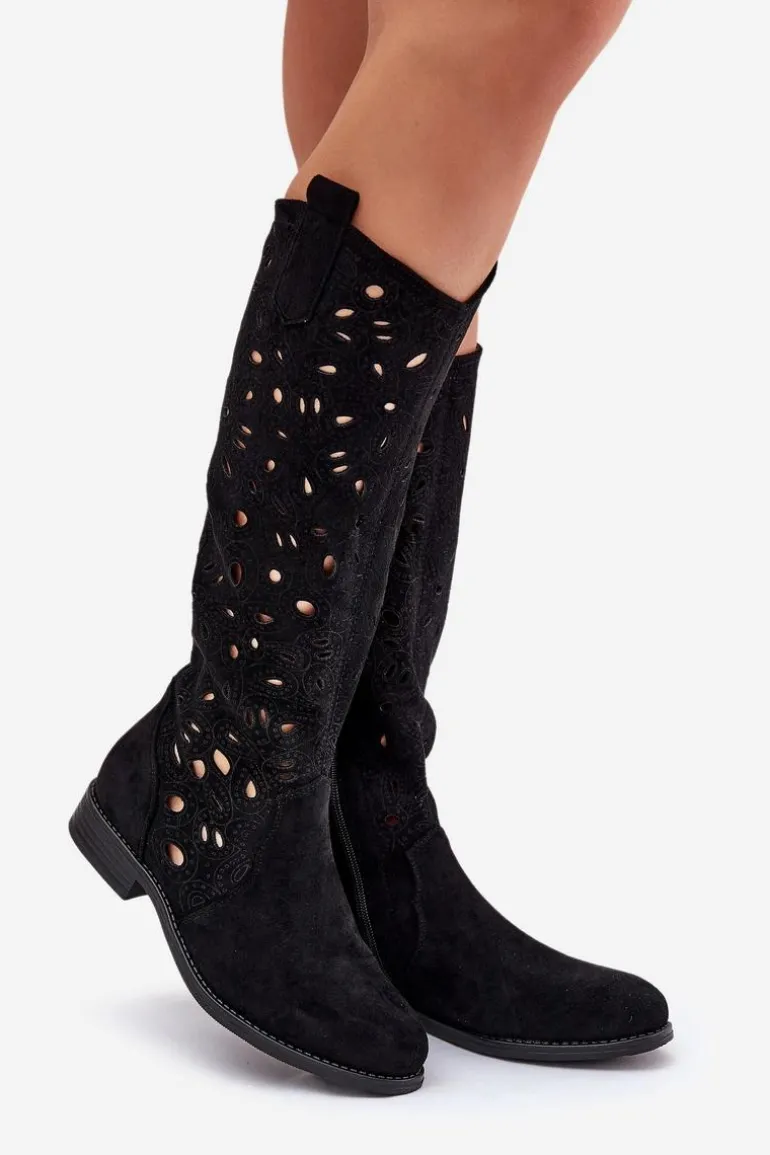 Ażurowe Kozaki Na Płaskim Obcasie HY51-176 Czarne