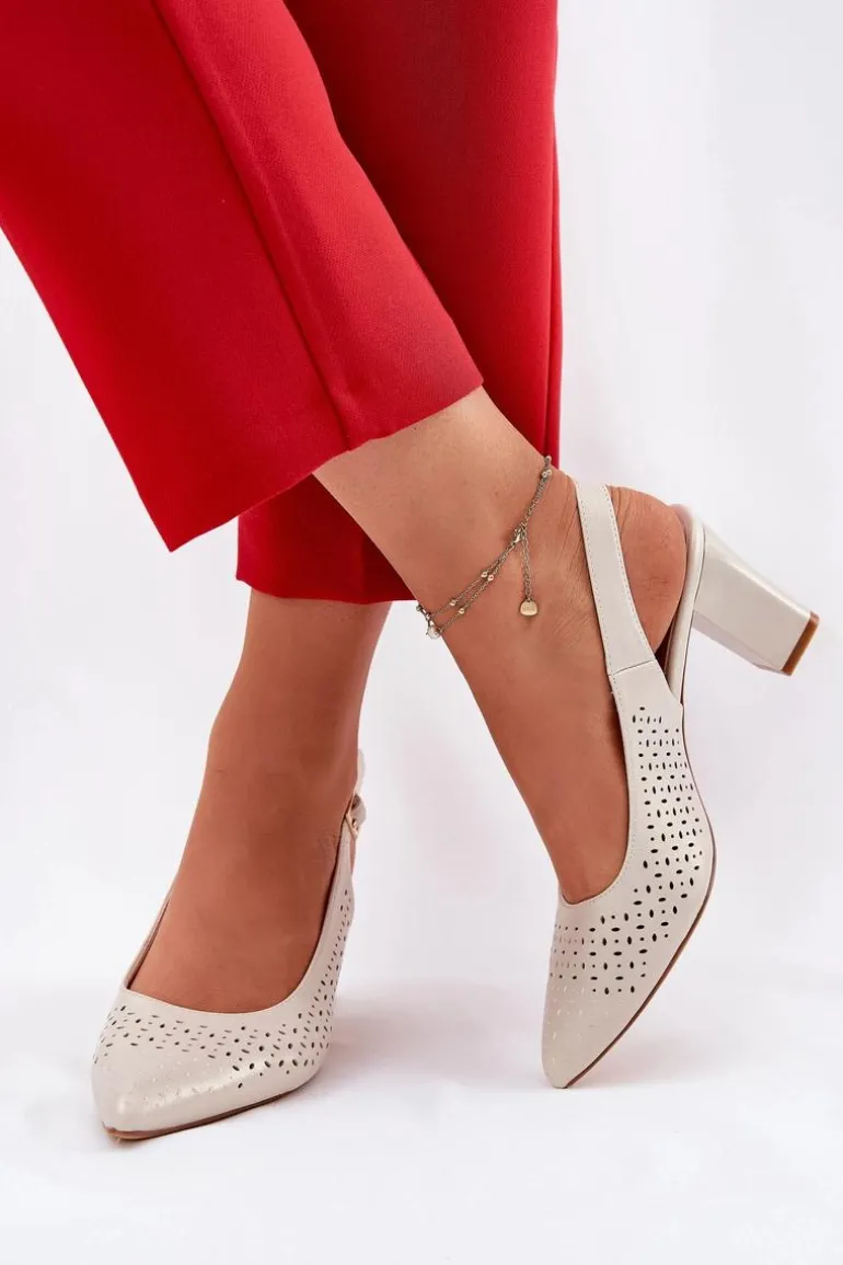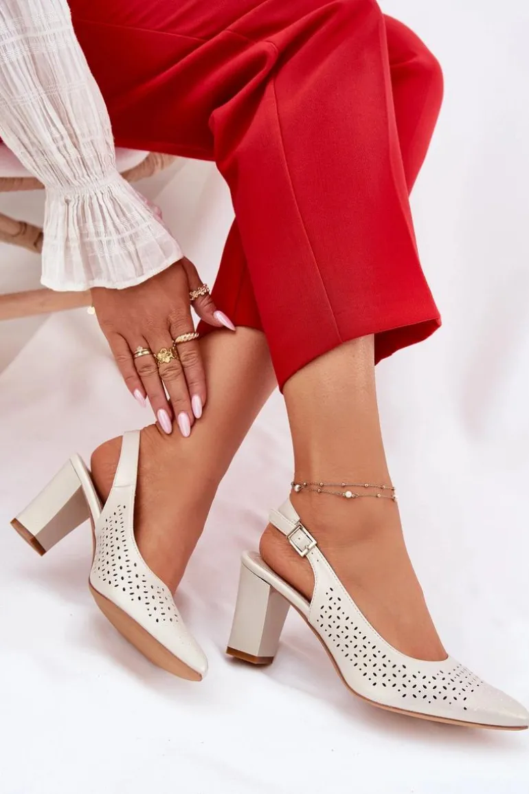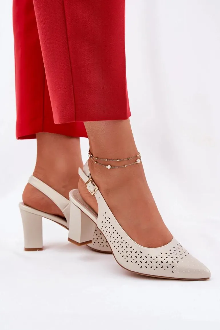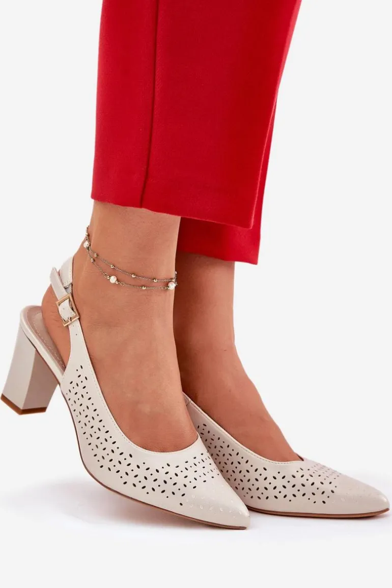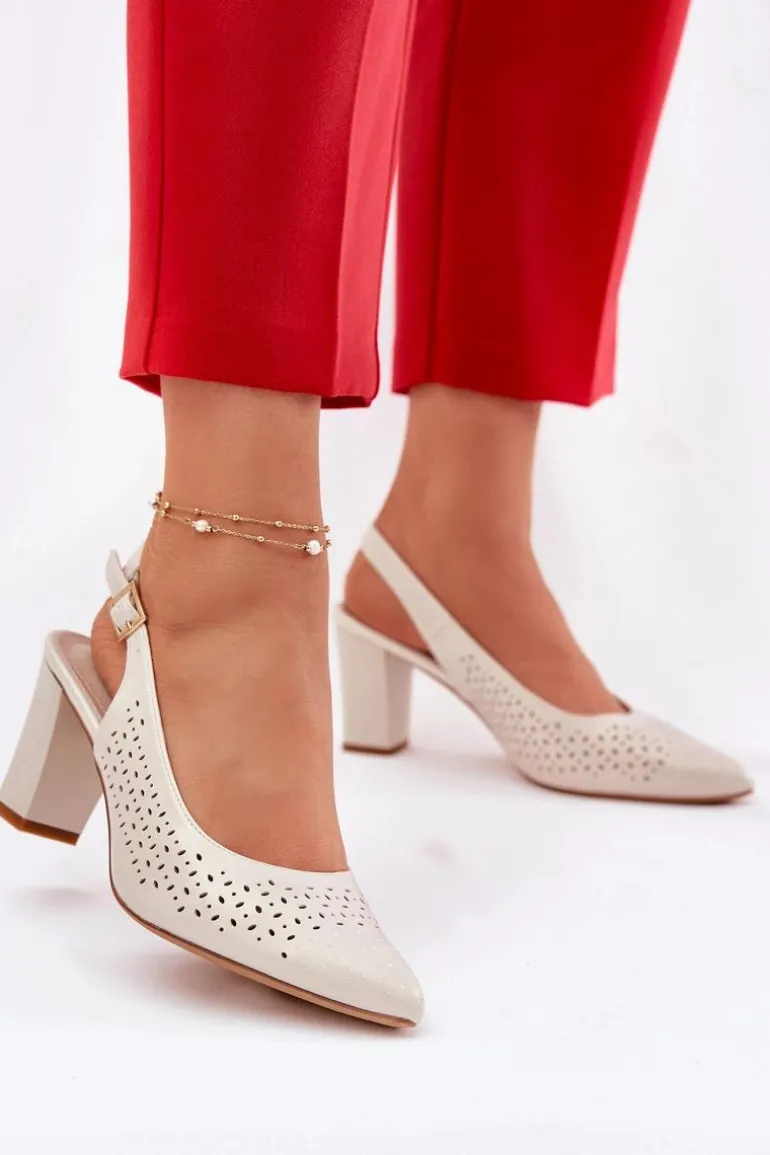 Sandały damskie wykonane z eko skóry, ozdobione ażurowym wzorem, to elegancki wybór na ciepłe dni. Szpiczaste noski subtelnie wysmuklają nogi, dodając im smukłości. Zapinane na sprzączkę z regulowanym paskiem, pozwalają na idealne dopasowanie do stopy. Obcas w formie słupka zapewnia stabilność, a całość łączy styl i wygodę, doskonale komponując się z letnimi sukienkami, spódnicami czy eleganckimi spodniami. Przy wyborze rozmiaru prosimy sugerować się tabelą rozmiarów.