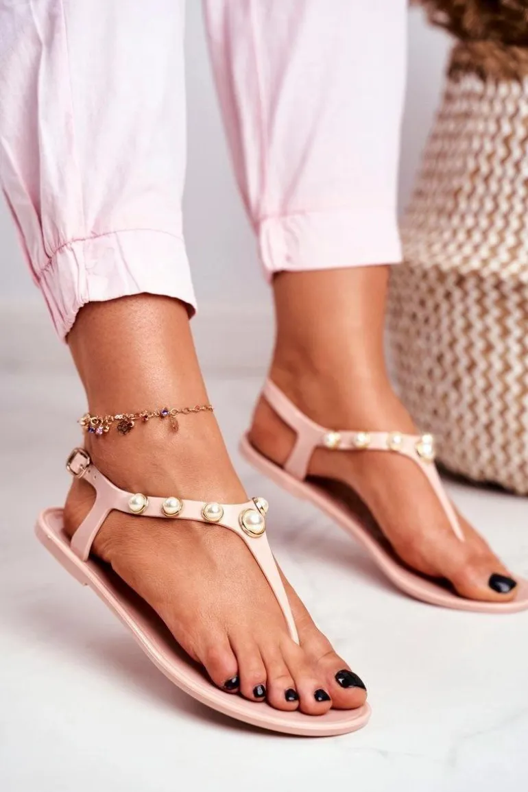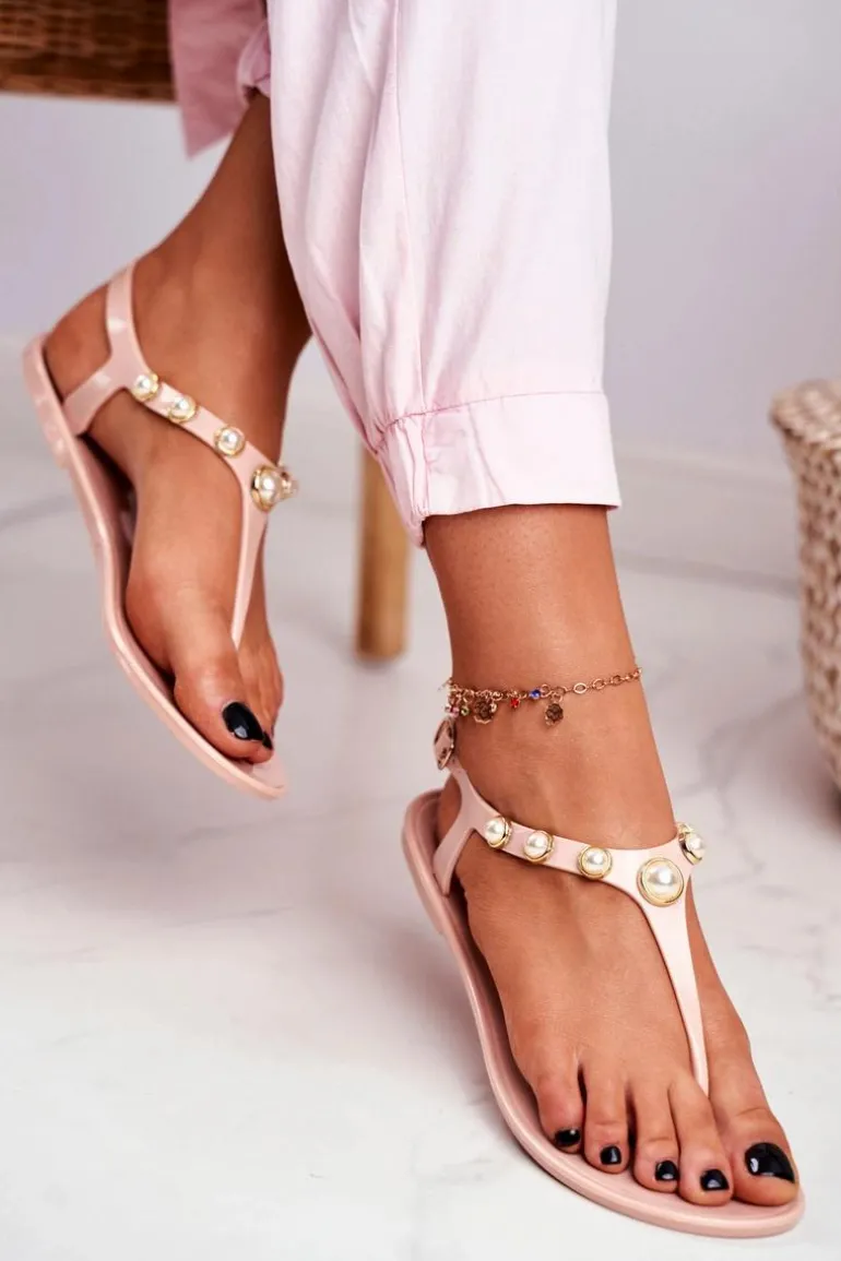 Beżowe Damskie Gumowe Sandałki Japonki Perełki Denise