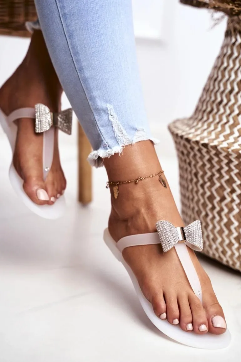 Białe Damskie Klapki Japonki Meliski z Kokardką Cekiny Morello