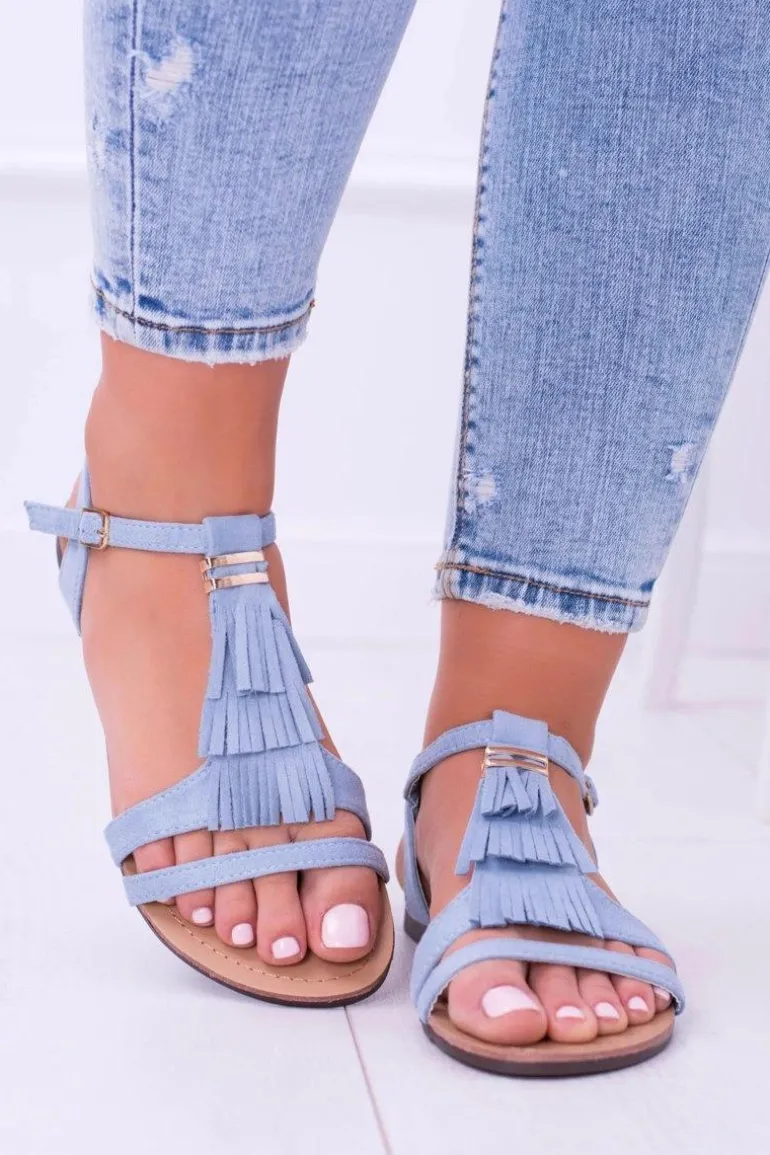 Błękitne Płaskie Zamszowe Sandały z Frędzlami Viva
