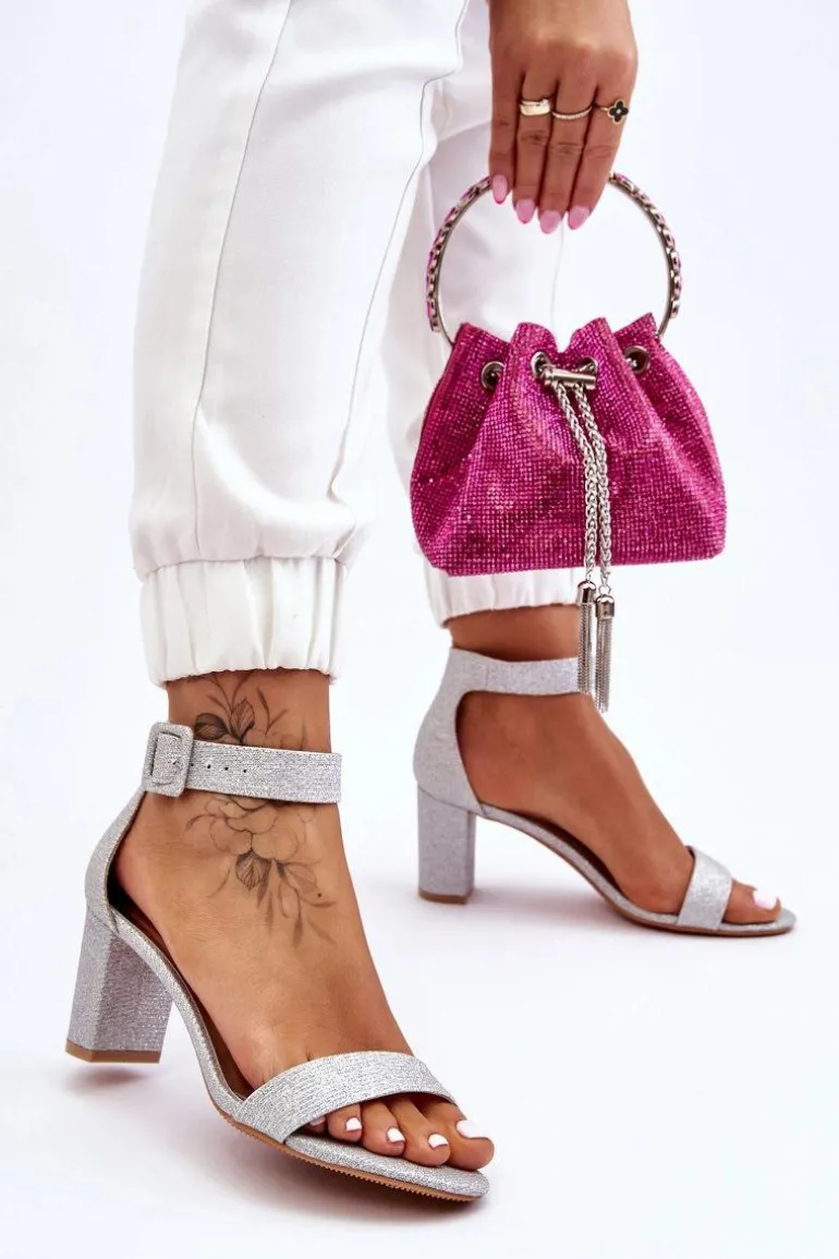 Klasyczne, damskie sandałki na niskim obcasie w postaci słupka. Model ten został wykonany z tworzywa sztucznego z brokatem. Zapinane wokół kostki na regulowany pasek ze sprzączką. Idealne na różnego rodzaju imprezy! Posiadają usztywniany zapiętek. Koniecznie powinnaś je mieć! Przy wyborze rozmiaru prosimy kierować tabelą rozmiarów.