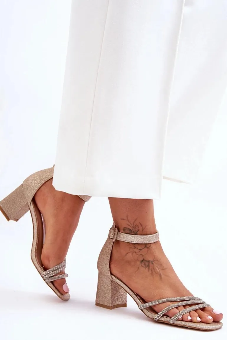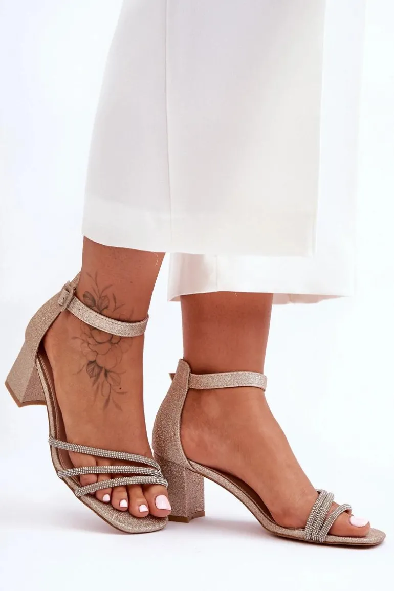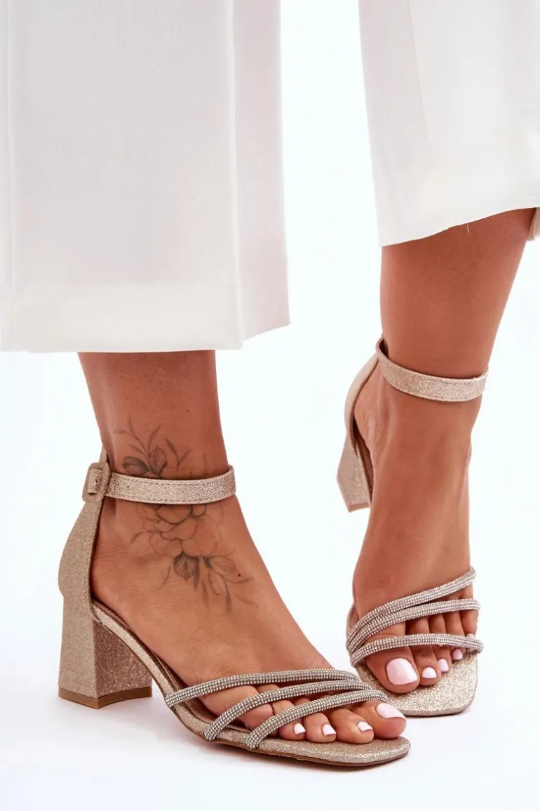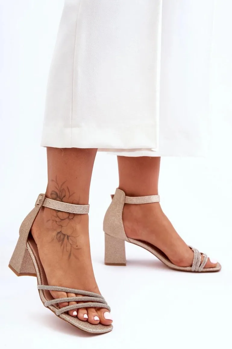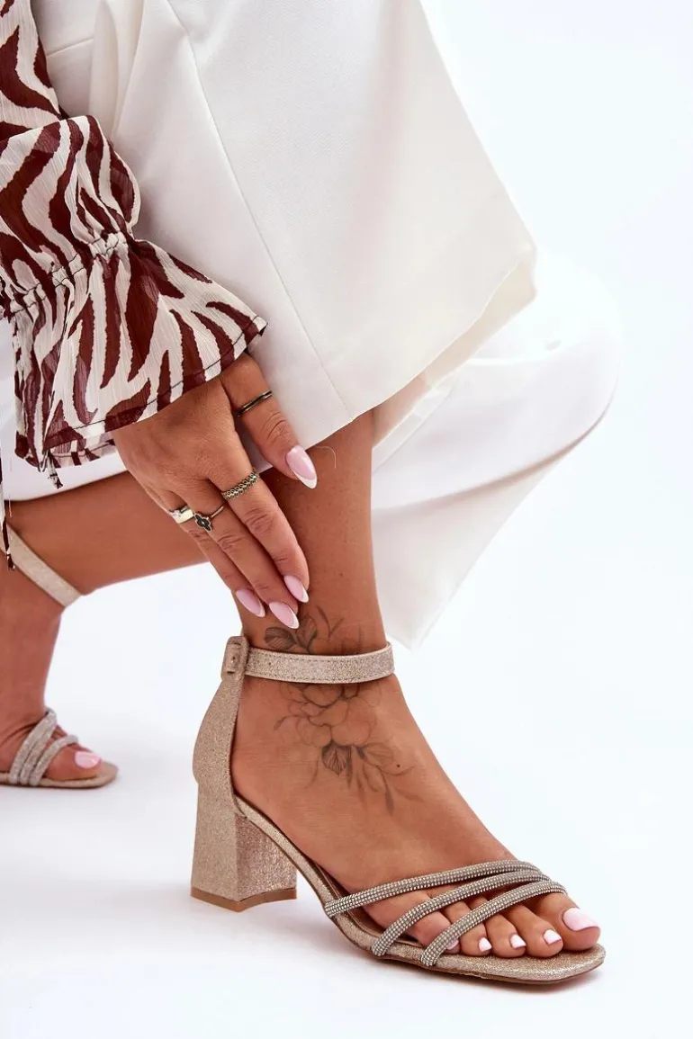 Klasyczne, błyszczące damskie sandałki na niskim obcasie w postaci słupka. Z przodu zdobione małymi cyrkoniami. Zapinane wokół kostki na regulowany pasek ze sprzączką. Idealne na różnego rodzaju imprezy! Koniecznie powinnaś je mieć w swojej szafie! Przy wyborze rozmiaru prosimy kierować tabelą rozmiarów.